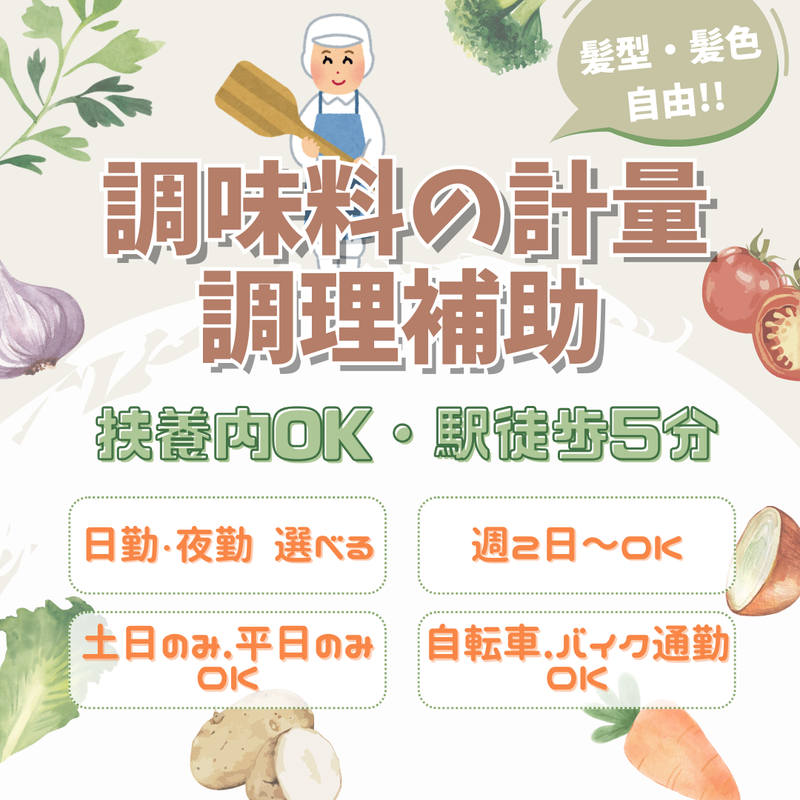 仕事内容 ≪仕事内容≫ お惣菜の原料仕込み・計量作業 スーパーに並んでいるポテトサラダやお惣菜を作る為に 調味料の計量をしていただき、 専用の袋や容器に入れていたいただくだけ。 その他、 野菜の皮むき、マカロニ・スパゲッティなどの茹で作業 就業時間や休憩時間もハッキリと決まっているので、 自分の予定や計画が立てやすいのもメリットです。 一つのことに没頭できる方、 コツコツした作業が好きな方にはうってつけのお仕事です。 ≪具体的には…≫ ・調味料の計量 ・野菜を専用の容器に乗せるだけ ・ポテトサラダをトレーに乗せて計るだけ ・茹で上がったマカロニを専用の容器に乗せるだけ など 髪型・髪色自由 扶養内で就業OK 「夜勤」 「週休3日制OK」 「完全週休3日OK」 「週2日勤務OK」 「週3日勤務OK」 「週4日勤務OK」 「ガッツリ週5日勤務も歓迎」 「扶養内勤務も歓迎」 「土日のみの週2日勤務OK」 「平日のみ勤務OK」