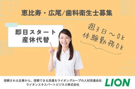 仕事内容 【お仕事の内容】 【歯科衛生士業務全般】 1.メンテナンス業務 治療とは別に、DHのアポイントでクリーニング、メンテナンスを行います 2.歯周基本治療 C処置とは別に並行して、DHのアポイントで歯周治療を行います 3.医院、Drマネジメント Drと協力して、患者の治療計画の作成、手術スケジュールの管理など、治療の全体的な管理を行います 4.教育指導業務 医院全体を把握し、後輩のDHやスタッフの指導教育して医院業務の円滑化をお願いします ※歯科医院勤務未経験の方は除外 5.医院運営業務 医院運営を円滑に進めるために必要な在庫管理や発注業務、院内整備をお願いします ★インセンティブあり:ホワイトニング・メンテナンス・インビザライン・インプラント等の契約取得が対象 【お仕事のポイント】 メンテナンスやホワイトニング、歯周基本治療など、 歯科衛生士として専門性を活かした業務をお任せします。 診療においてはドクターと密に連携し、 治療計画の立案や手術スケジュールの管理などにも関わっていただきます。 単なるアシスタント業務にとどまらず、診療の全体像を見据えたマネジメント業務に携わることで、 歯科衛生士としての総合的な力を養い、確かな成長を目指したい方に最適なポジションです。 【営業のおすすめポイント】 9月からスタートする最長2年間の産休代替のお仕事です。 東京都内に3つの歯科医院を展開する法人グループで、スタッフは全員常勤、 20~30代の若手が活躍する明るく活気ある職場です。 平日はしっかり8時間勤務、日曜・祝日は6時間半勤務と、 メリハリある働き方ができ、残業もほとんどありません。 事前に職場の雰囲気を確認できる体験勤務(時給支給)制度があり、不安なくスタートできます。 法人には事務局が併設されており、業務や勤務に関する相談もしやすい安心の体制が整っています。 安定した環境で、スキルを活かしながら次のステップにつなげたい方におすすめの職場です。 【ライオングループの専門性を活かして派遣が初めての方も安心してスタートができる!】 ライオン株式会社のグループ会社として、安心・安定した環境をご提供しています。 オーラルケアや衛生管理に強みを持つライオンならではの知見を活かし、 歯科衛生士・歯科技工士の方々に向けた専門性の高い人材派遣・紹介サービスを展開。 臨床だけでなく、企業での活躍を目指す方にも多数の紹介実績があり、 就業前後の丁寧なフォロー体制で、企業と働く人の双方に寄り添います。 オンライン面談やLINEでのサポート体制も整っており、派遣登録から就業まで安心してご相談いただけます。 あなたに合った、質の高い働き方を、ライオングループがしっかりサポートします。