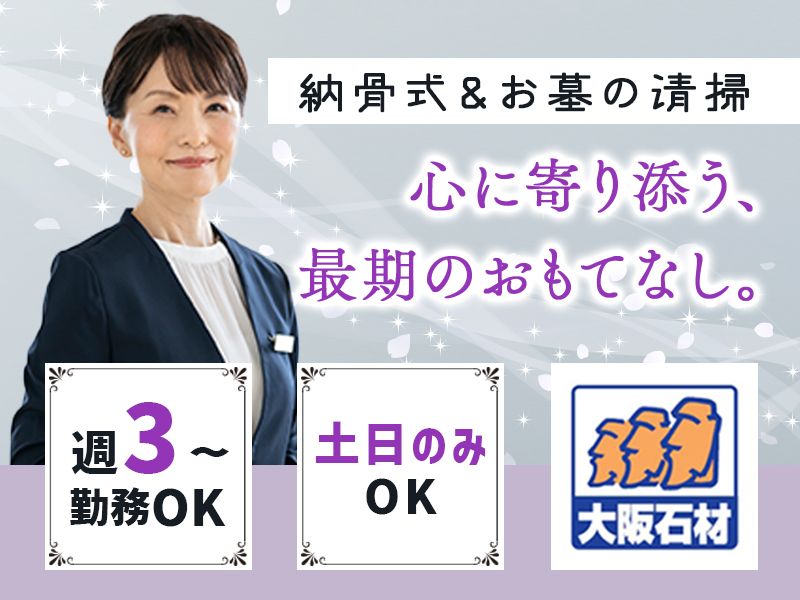 仕事内容: 開眼納骨式のお手伝いをメインに、 墓地・霊園の清掃のお仕事を お任せします◎ 【具体的なお仕事内容】 ■納骨式でのお仕事 (事前準備や後片付け) ・式が始まる前の墓地・霊園の清掃 ・参列者の記録 ・納骨式の風景の撮影 ・後片付け ・報告書の作成 など ※納骨式は多くても1日2件です (基本的には土日祝のみ) ■墓地・霊園での清掃のお仕事 ・全体の掃き掃除 ・枝の剪定 ・夏場の草抜き など ※1現場数名で作業をします。 \1日の勤務内容☆/ 午前:納骨式 午後:清掃業務(納骨式がない日は午前から清掃) 雨天で清掃業務が中止になった際は、 ポスティング作業を行います◎ 1人での作業も多くありますが、 わからないことや困ったことがあれば 先輩がしっかりとサポートしますので、 ご安心ください^^ あなたのペースで着実に 知識やスキルを身に付けられます◎