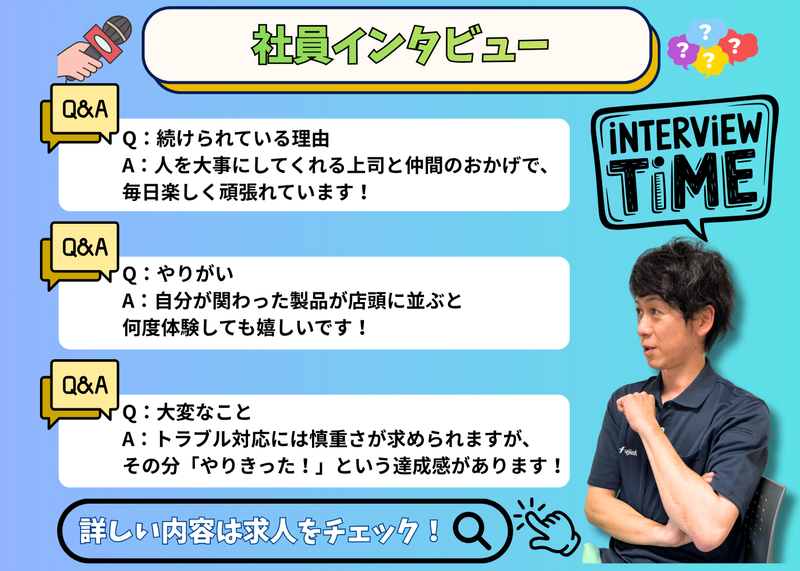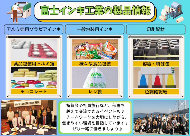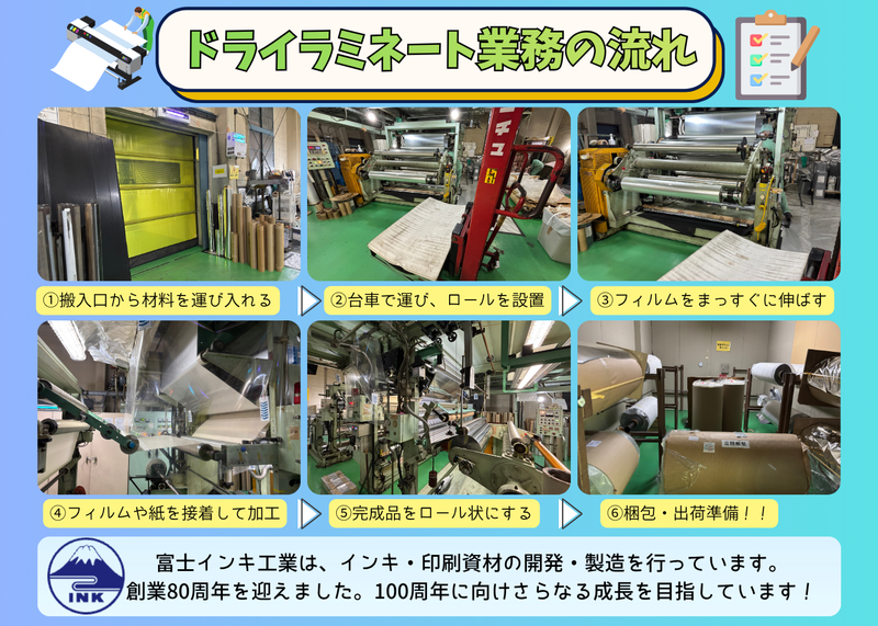 仕事内容 \\残業少なめ&夜勤なし// ⏰ドライラミネーターのオペレーター募集⏰ 富士インキ工業株式会社は、インキ製品・印刷資材を中心に開発・製造を行っています! 品質や環境にこだわり続け、おかげさまで創業80周年を迎えました。 100周年に向け、さらなる成長を目指しています! 今回は、ドライラミネートの機械オペレーターとしてご活躍いただける方を募集中! 印刷オペレーターの経験や印刷業界での経験をお持ちの方は、すぐに力を発揮できる環境です! - ✅仕事内容 ◆ドライラミネート作業とは? フィルムや紙、アルミ箔などの基材を貼り合わせて、製品を作るお仕事です。 ◆主な製造品 お菓子や惣菜の袋、建材の壁紙など、日常で使われるさまざまな製品を手掛けています。 ◆具体的な業務内容 ■ロール搬入:搬入口から材料を運び入れる ■機械へセット:台車で運び、ロールを機械に設置 ■フィルムを展開:フィルムをまっすぐに伸ばして準備 ■接着・貼り合わせ:フィルム同士、または紙・アルミを接着剤で貼り合わせ ■巻き取り作業:仕上がった製品をロール状に巻き取る ■梱包・出荷準備:製品を丁寧に梱包し、出荷準備完了! その他、機械のメンテナンス など ※20~50kgの重量物を扱う場面もありますが、 接着剤の計量や運搬は、タイヤ付きの台やリフトを使えるので安心です♪ (リフトは免許がなくてもOK!) 作業は、30~50代の男性スタッフ3名でチームを組んで行っています。 1チームで協力しながら、作業を進めます✨ ≪入社後の流れ≫ ・OJT研修:入社後半年を目安に実施 ・資格取得支援:危険物取扱者資格を会社負担で取得可能(同じ資格であれば2回まで挑戦可能) ・勉強会:月1回の社内・ウェブ勉強会あり。必要に応じて研修も実施 - ✅当社で働く魅力! ◎少人数部署で声が通りやすく、困った時はすぐに助け合える雰囲気◎ ◎機械作業が多いので、機械いじりが好きな方にもピッタリ! ◎夜勤なし&残業があっても1日1時間ほどなので夜もゆっくり過ごせます♪ ◎体験入社可能!希望があれば、面接後の入社前に業務体験ができます◎ ◎賞与年2回(7月・12月)!昨年は年間で2.5ヶ月分支給されました♪ ◎ネットフリックス手当など手当&福利厚生も充実! ◎宅配弁当や食事補助(350円~500円)など、食事サポートあり! ◎休憩も快適!休憩室には冷蔵庫・電子レンジも完備♪ ◎夏には、冷却ベストやスポーツドリンク支給で暑さ対策もバッチリ! - ✅社員インタビュー【入社20年/Gさん】 Q:入社のきっかけを教えてください A:工業高校を卒業後、車のナンバープレートを作る会社に入社しましたが、社内の雰囲気が窮屈に感じていました。「トラックに関わる仕事がしたい!」と思いつつも定職につかず迷っていたところ、ハローワークで当社の求人を発見。 元々ものづくりが好きだったので、ドライラミネート加工の仕事にも興味が湧き入社を決めました! Q:続けられている理由を教えてください A:運悪く怪我をして辞めようかと思ったとき、本社(兵庫県)の上司の方々がすぐに福岡へ来てくださり、励ましの言葉や悩みを真剣に聞いてくれました。 その行動が大変嬉しく、この人たちについていきたい!恩返しをしたい!と心から思いました。 大変なこともありますが、人を大事にしてくれる上司やチームの仲間と協力しながら、楽しく働けていることが頑張れる理由です! Q:やりがいを教えてください A:自分が関わった製品が店頭に並んでいるのを見ると、とてもやりがいを感じます。 商品本体ではなくそのパッケージなどを作っているため、縁の下の力持ち的な役割ですが、「自分の仕事が世の中に出ている」と実感できる瞬間が嬉しいです。 特にアルミの広幅加工は難しいですが、完成したときの喜びは格別!需要も高く、やりがいのある仕事です! Q:逆に大変なことを教えてください A:トラブル対応には慎重さが求められます。 納期もあるため、自分で考えて対応する場面もありますが、その分「やりきった!」という達成感や成長を感じられる仕事です! Q:求職者に一言お願いします! A:私たちは現在3名のチームで協力しながら働いています! 2025年11月には創業80周年の記念式典や社員旅行があったりと、仕事だけでなくみんなで盛り上がれるイベントもありました! 新しい仲間が加わることを、メンバー全員楽しみにしています!ぜひ一緒に働きましょう♪
