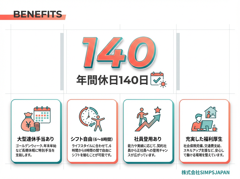 アピールポイント: 【責任者!高井からのメッセージ】 少しだけ聞いてください!!! 当社のような小さい会社を選んでくれた以上、私はスタッフに成長してもらう責任があると考えています。 「SIMPSJAPANで働いていた経験があって良かった!」「SIMPSJAPANで働いていて楽しい」と思ってもらえるように頑張ります! 「目の前のことを真剣に!」「仕事を真剣に!」「勉強も真剣に」「成長も真剣に」「休みも真剣に」 全てのことに真剣に向き合ってもらえるように私も全力でスタッフに向き合います。 その結果、お客様に喜んでもらいましょう♪ 仕事上、お客様対応などはありませんので、体調不良やお子様の熱などで急遽休みになっても問題ございません。 当社は自由な働き方に寄り添って考えております。