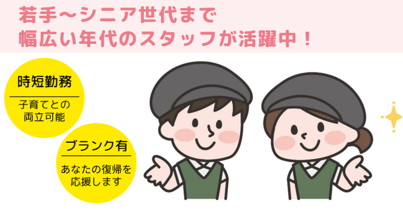 選考プロセス WEBまたは電話にてご応募ください。 WEBの場合は応募内容確認後に こちらからご連絡いたします。 電話の場合は「求人情報を見ました」と お伝えください。質問のみもOKです。 【選考の流れ】 1.応募 2.面接 3.入社 現在、他のお仕事をしている方も ぜひご応募ください。面接日や 入社時期はご相談に応じます。 友達同士の応募も歓迎! 一緒のシフトに入れる事も多い環境です