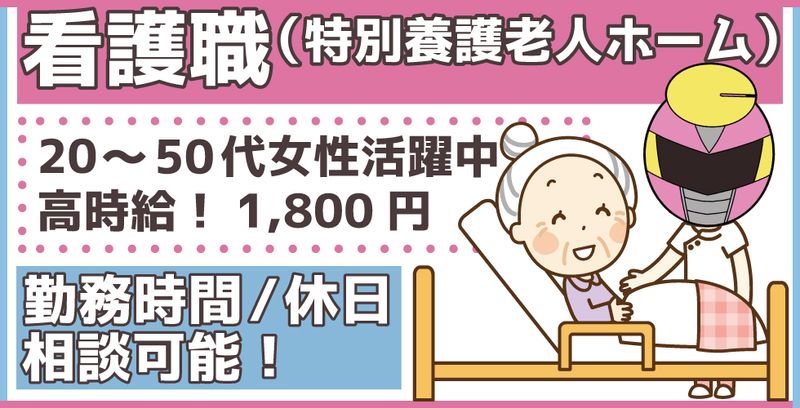 仕事の内容 【看護師・准看護師資格をお持ちの方へ】 \高時給&柔軟な働き方で私生活も充実/ ≪おすすめポイント≫ ・高時給1,800円!資格を活かして安定収入を実現♪ ・柔軟なシフト対応で、家庭やプライベートと両立しやすい! ・残業なし!仕事後の時間も有効活用 ≪仕事内容≫ 特別養護老人ホームでの看護業務を担当していただきます(^^♪ 入居者様が安心して過ごせるよう、健康面をサポートするお仕事です。 ◆主な業務内容◆ ・入居者様の健康管理およびバイタルチェック ・医療機関への受診時の付き添い ・施設内の嘱託医の回診サポート ・胃ろう処置 ・その他、看護業務全般 ≪職場環境≫ 幅広い年齢層(20代~50代)の女性スタッフが活躍中! 明るく協力し合える、働きやすい雰囲気が魅力です。 ≪こんな方におすすめ≫ ・看護師または准看護師の資格をお持ちの方 ・人と接することが好きで、思いやりを大切にできる方 ・仕事と家庭を両立しながら、自分のペースで働きたい方 ≪その他ポイント≫ ・制服貸与 ・無料駐車場完備 ・受動喫煙対策あり(屋外喫煙所設置) ◆就業時間や休日検討致します!◆ 勤務条件やシフトについてのご希望があれば、ぜひお気軽にご相談ください。 あなたのスキルを活かして、一緒に働きませんか? ★本求人にご興味をお持ちの方は、応募する!より必須項目記載の上、 お問合せ下さい。 (お電話でのお問合わせ先:0120-67-3244 ※平日9時00分~18時00分)