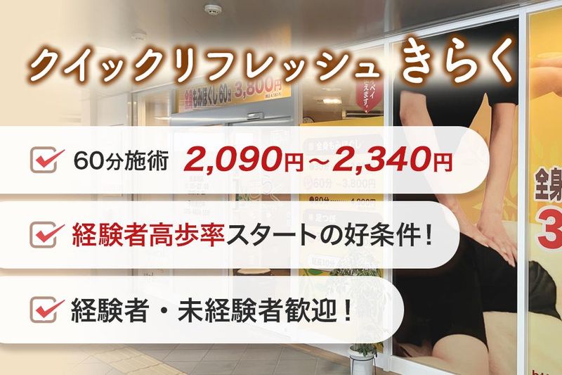 仕事内容 ─────[おすすめポイント]────── ★選べる働き方!日数・曜日相談OK! ★経験者技術チェック後、即日勤務可能! ★登録料2,000円/1店舗で系列店Bフィット ネス使い放題! ────────────────── ~ ココロとカラダを気楽に リフレッシュがテーマの⼈気サロン~ 『クイックリフレッシュ きらく』では セラピストのスタッフを募集しております 専門の技術を用い お客様に心のこもった癒しを提供する、 とてもやりがいのあるお仕事です そんな「きらく」で一緒に働きませんか? 完全歩合制◆働いた分だけリターン!  ̄ ̄ ̄ ̄ ̄ ̄ ̄ ̄ ̄ ̄ ̄ ̄ ̄ ̄ ̄ ̄ ̄ 売上の55%~61.6% 60分施術 2,090円〜2,340円 あなたの技術と心遣いが そのままお客様の満足と 収入につながります ******* ▼ 仕事内容 ▼ ******* <施術メニュー例> ・もみほぐし ・リフレクソロジー(足つぼ) あなたの技術でお客様に 安らぎと最高のひと時を ご提供してください ────────────── 専用の技術スクールあり ────────────── ~無料で丁寧な技術指導が受けられる~ ▶技術の不安を解消! ・一度に全部を覚える必要はなく できる内容から順番に身につけられるので 最初はできなくても講師と一緒に乗り越え られます ▶デビューの不安を解消! ・接客を想定した練習を繰り返すので 不安なままデビューする事はありません ー ※講習期間:1日~30日前後