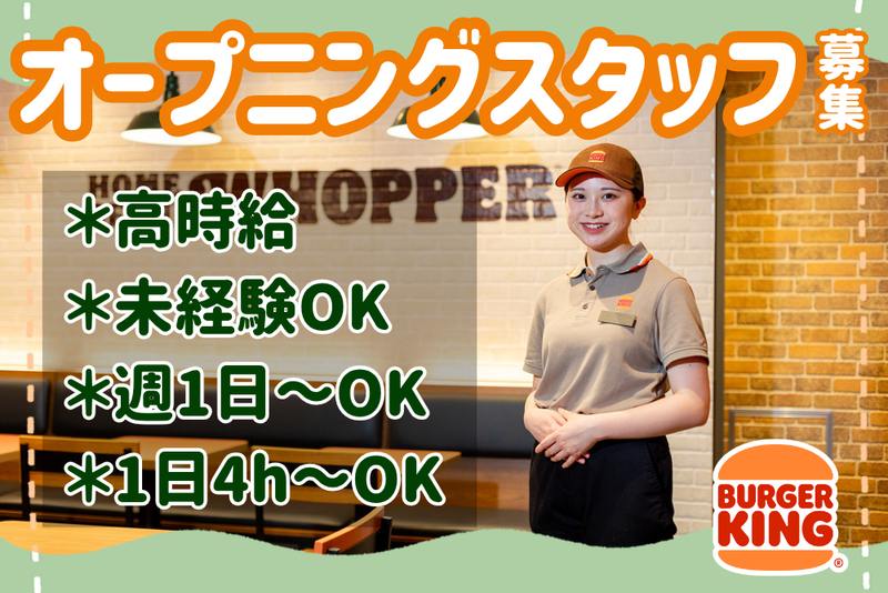 仕事内容 ★バーガーキング イオンタウン津城山店★ \\ 12月23日(火)にオープン // \\ オープニングスタッフ募集! // ★大学生、フリーター活躍中★ ━━━━━━━━━━━━ 仕事の詳細 ━━━━━━━━━━━━ ・食材のカットやバンズに詰める作業 などの調理補助 ・ハンバーガーやサイドメニュー、 ドリンク作り ・オープンやクローズ時の 簡単な店内清掃作業 *丁寧なマニュアルと先輩がサポートして くれるので安心して働けます♪ 普段は料理をしないという方でも 大丈夫です! ━━━━━━━━━━━━ オススメPOINT◎ ━━━━━━━━━━━━ *特別オープニング時給1300円!! *週1日~5日まで曜日や時間も選択可! *1日4h~OK!! 「午前のみ」「午後から」 「学校帰りに」「子どもの学校の 時間だけ」などOK! *「子育てが落ち着いたから久しぶりに 働きたい」など、 ブランクのある方も大歓迎! *バーガーキングファン必見の社割あり! (嬉しい30%OFF) ━━━━━━━━━━━━━ バーガーキングについて ━━━━━━━━━━━━━ バーガーキングでは、お客様を <笑顔>にするために スタッフ一人ひとりが<笑顔>で接客する 事を大切にしています。 商品の提供を通してお客様を 笑顔にする事はもちろんですが、 そのためにはまず、スタッフの笑顔が 欠かせないと考えております。