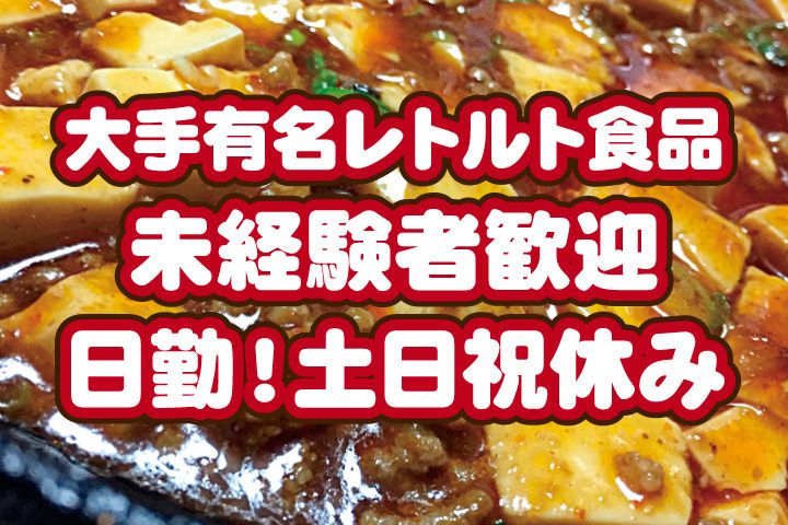 仕事内容 シンプル・軽作業メインのコツモク食品製造 未経験者歓迎!1週間程度で覚えられるお仕事 作業中も丁寧にサポートしてくれる職場です 大手メーカー・レトルト食品業界でも 名の知れたブランド商品を作りませんか? 現在、20代・30代・40代・50代活躍中 \おすすめポイント/ ◎かんたん繰り返し作業で未経験でも安心 ◎日勤固定&土日祝休みでプライベート充実 ◎勤務3年で5,000円の給与ベースUP ◎明るい髪色OK!オシャレも楽しめる -◆-◇-◆-◇-◆-◇-◆-◇-◆-◇-◆- 【主なお仕事内容】 麻婆豆腐の素や釜飯の素などの 有名レトルト食を中心とした食品製造 食品製造工場で身近な商品をつくります。 空調が整った清潔・キレイな食品工場! スポットクーラーもあり夏場も快適です。 -◇-◆-◇-◆-◇-◆-◇-◆-◇-◆-◇- \こんな方におすすめ/ ◆子育てが落ち着きフルタイムの仕事をお探しの方 ◆未経験だけど何か新しい事を始めてみたい方 ◆土日祝休みでプライベートも充実させたい方 ◆食品メーカー・食品工場で正社員・アルバイト・ パート・派遣の経験をお持ちの方 ◆ハローワークでもお仕事をお探し中の方 求人内容の詳細については 面談時にご説明させていただきます。