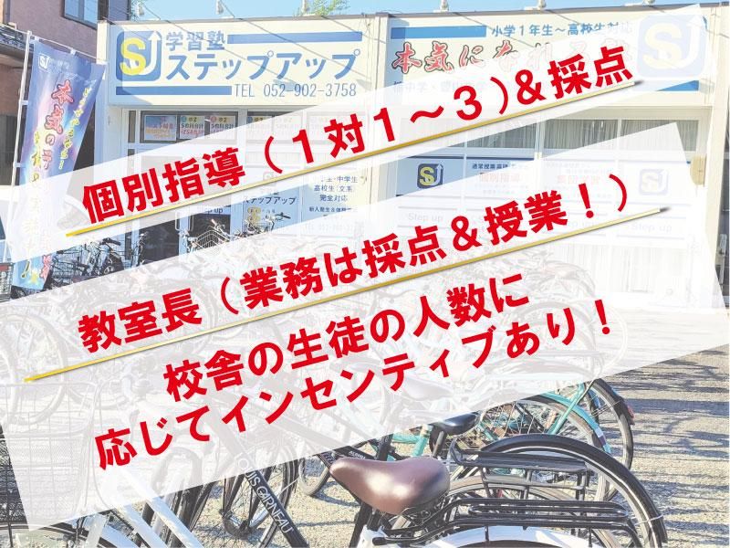 仕事内容 学習塾「ステップアップ」にて、 小中学生を対象とした学習指導 および運営補助をお任せします。 【具体的な業務内容】 ■個別指導(講師1名に対し生徒1〜5名) ・小学生:国語、算数、英語 ・中学生:英語、数学 ■確認テストの採点および記録 ■生徒の学習状況のモニタリング 当塾では、学力を高めることは もちろん、学習の楽しさを 伝えることを大切にしています。 【キャリアと評価】 生徒一人ひとりと向き合い、 着実に成果を出すことで、 生徒数の増加に応じた インセンティブを支給。 あなたの貢献を正当に評価し、 給与へ反映する仕組みです。 ✨アピールポイント ー 【貢献度を正当評価】 生徒数に応じた報酬アップあり。 やりがいを数字として実感できる 評価制度を整えています。 【ワークライフバランス】 週3日から、1日4〜5時間の勤務。 残業も一切なく、プライベートと 両立可能です。 【通勤の利便性】 昭和校は無料駐車場を完備。 車やバイクでの通勤も可能で、 天候を問わず通いやすいです。 【良好な職場環境】 風通しが良く、相談しやすい雰囲気。 教育への熱意を持つ仲間と共に 成長できる職場です。