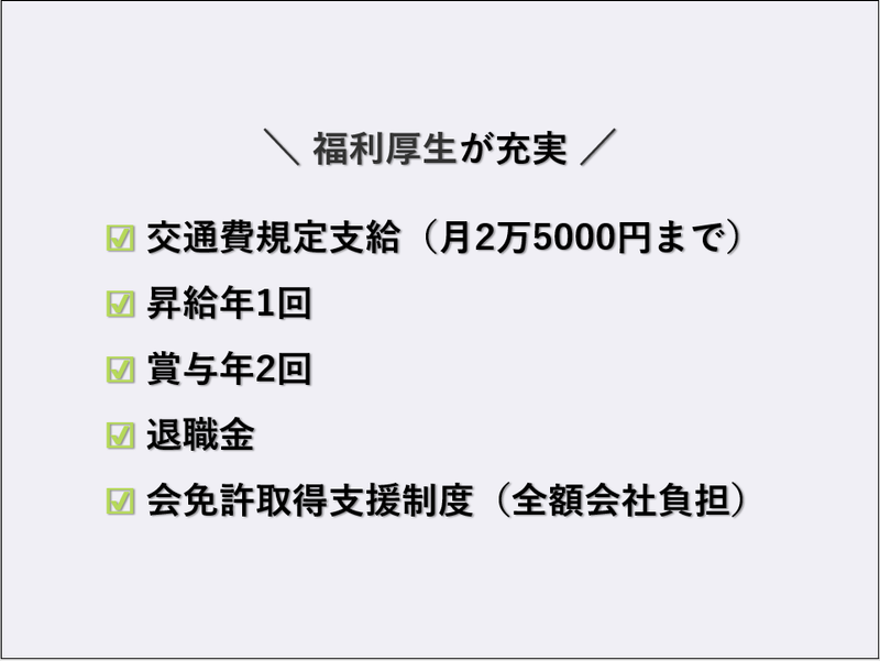 選考プロセス <応募後のプロセス> 1.応募 ↓ 2.担当者より面接日程の調整などのご連絡をさせて頂きます。 ↓ 3.面接実施(1回だけ) ↓ 4.内定合否のご連絡 ↓ 5.入社手続き等 *面接時履歴書不要! *応募前職場見学OKなので、気軽にご応募ください。 *在職中など今すぐの転職が難しい人も、ご相談ください。