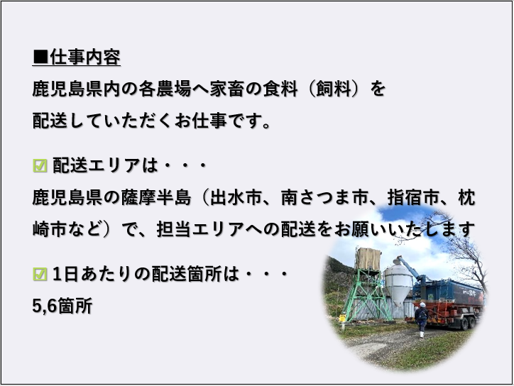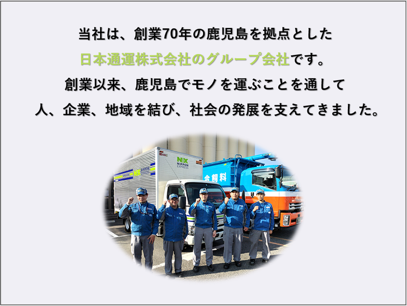 仕事内容 ―⭐アピールポイント⭐―――――― ✅安心と信頼の "日本通運株式会社"グループ会社 ✅創業から70年、鹿児島でモノを運ぶことを通し、 社会の発展を支えてきました ✅普通自動車免許があれば未経験OK! ✅大型免許取得支援制度あり◎ ✅充実した福利厚生 (賞与年2回・昇給年1回など) ✅面接時履歴書不要ですので、 お気軽にご応募ください☆彡 ――――――――――――――――― 【✨仕事内容✨】 鹿児島県内の各農場へ 家畜の食料(飼料)を 配送していただくお仕事です 配送エリアは… 鹿児島県の薩摩半島(南さつま市、指宿市、枕崎市など)で、 担当エリアへの配送をお願いいたします 1日あたりの配送箇所数は… 5,6箇所 配送に使うのは… バルク車という、 飼料など粉状のものの運搬に使用される 特殊な自動車です 重い荷物を運ぶ作業は… 機械作業なので、力作業はありません! 必要な免許は… 大型自動車免許です ※普通自動車免許のみの方は応相談 最初は先輩スタッフが隣について 教えながら進めていただくので、 未経験の方もご安心ください◎ *・。*・。*・。*・。*・。*・。* 【✨とある1日の流れ✨】 04:30~ 積込み・配送・積下ろし 09:00~ 休憩 10:00~ 積込み・配送・積下ろし 13:30~ 退勤 *・。*・。*・。*・。*・。*・。* 【✨従業員の声✨】 ■配送担当・清藤さん(30代) 未経験の物流業界だった為、最初は失敗もありましたが弊社の厚いサポートのおかげで、現在は大型トラックの業務に従事しております。 また、弊社は全車両デジタコを搭載しており「安全を最優先」にしているからこそ私たちも安心して働けます。 今後も運転技術の向上に努めます。 ■配送担当・海江田さん(40代) 環境に優しい鉄道コンテナ配送をしております。 手荷役作業もある体力仕事ですが、その分、達成感もあり体力もつけることができます。 業務に関わらず社員のコミュニケーションもとり、全員で支え合う最高の職場です。 *・。*・。*・。*・。*・。*・。* 【✨社長メッセージ✨】 当社は、昭和27年7月に設立された鹿児島を拠点とした日本通運株式会社のグループ会社です。 創業以来、鹿児島でモノを運ぶことを通して、人、企業、地域を結び、社会の発展を支えてきました。 安全に徹し、環境に配慮し、鹿児島を舞台にすべての力を結集して、物流から新たな価値を創造することに挑戦していきます。 いつの時代にも、社会から求められ、信頼されることを誇りに行動します。 「物流で鹿児島を創る」 ため、一緒にはたらく仲間を大募集しております。 *・。*・。*・。*・。*・。*・。* 【✨会社URL✨】 https://nittsu-kagoshima-unyu.com/ *・。*・。*・。*・。*・。*・。*