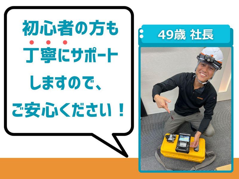 仕事内容 ⏩【脱・個人プレー】 ┗3〜4名のチーム制 部活のような一体感で現場を完遂 ⏩【実力主義の効率化】 ┗無駄を省き、早く終われば日給保証 ダラダラ残業とは無縁 ⏩【一生モノの武器】 ┗国家資格の取得費用は全額会社負担 手に職をつけ、将来に備える ⏩【プロのこだわり】 ┗社長厳選!カッコいい作業着・道具支給 身なりから一流を目指す ⏩【安定のインフラ職】 ┗屋内作業メインで天候に左右されない 月給25万〜50万円の安定収入 ══════════════════ 「現場仕事に、新しい誇りと自由を。」  ̄ ̄ ̄ ̄ ̄ ̄ ̄ ̄ ̄ ̄ ̄ ̄ ̄ ̄ ̄ ̄ ̄ ̄ 無理な上下関係や、 根性論だけの働き方はもう古い。 私たちが求めているのは、 仲間のために動き、 プロとしてスマートに仕事を完遂できる 「POSSE(仲間)」です。 元配達員、元営業職など、 異業種からの転職者が多数活躍中。 「一人で数字を追う」 「一人でハンドルを握る」日々から、 チームで声を掛け合い、 最先端のインフラを支えるやりがいへ。 ══════════════════ ✊具体的なお仕事内容  ̄ ̄ ̄ ̄ ̄ ̄ ̄ ̄ ̄ ̄ ̄ 1人ではなく、 必ずチーム(3〜4名程度)で 作業を行います。 ◆携帯電話のアンテナ・機器設置 ┗駅やビルの屋上などで、 電波を届けるための設置・配線作業。 ◆防犯カメラ・Wi-Fiの設置 ┗オフィスや施設内での設置、 天井裏へのケーブル通しなど。 ◆駅構内の電気設備工事 ┗ホームドアに関連する設備など、 最先端のインフラに関わります。 ══════════════════ ✊この仕事のポイント  ̄ ̄ ̄ ̄ ̄ ̄ ̄ ̄ ̄ ̄ ̄ ✅チームで挑む、だから強い 作業は必ずチームで行います。 複雑な配線や設置も、 仲間と連携すればスムーズに進みます。 営業職で培った「コミュニケーション力」や 配達員で培った「フットワーク」が、 そのまま現場の推進力になります。 ✅効率の追求は、プロの証 「やる時はやる、終われば帰る」 現場をいかに正確に、 早く終わらせるかにこだわります。 早く終わっても日給は全額支給。 それは、あなたが集中して 高いパフォーマンスを発揮した 証拠だからです。 ✅ 「カッコよさ」への妥協なし 「現場仕事こそ、清潔感があって カッコいい存在であるべき」 これが社長の考えです。 支給される制服や道具にもこだわり、 プロとしてプライドを持って 現場に立てる環境を整えています。 ══════════════════ ✊会社概要  ̄ ̄ ̄ ̄ ̄ ̄ ̄ ̄ 社名の「POSSE(パスィ)」は、 英語のスラングで「仲間」や 「信頼する」を意味します。 社長も社員もフランクで、 仕事終わりに「家まで送るよ!」と 声をかけ合うような、 温かくて風通しの良い職場です。 ══════════════════