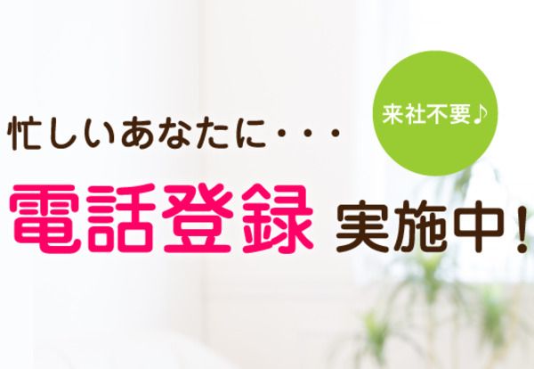 選考フロー 【STEP1】 WEBもしくはお電話で応募 【STEP2】 2営業日以内にお電話(0120-106-479) またはメールにてご連絡いたします。 【STEP3】 派遣登録のご案内&お仕事紹介 【STEP4】 書類選考(職場見学も可能) 【STEP5】 内定&就業 / 就業まで来社不要?! \ オンラインまたは電話にて、派遣登録を実施しております♪ 【派遣登録曜日・時間】 月~金曜日の下記いずれかのお時間にてご案内♪ (1)10:00~ (2)11:00~ (3)13:30~ (4)14:30~ (5)16:30~18:30までに開始 ★水・木のみ ※就業中の方で、上記時間帯にお時間が取れない方はご相談ください