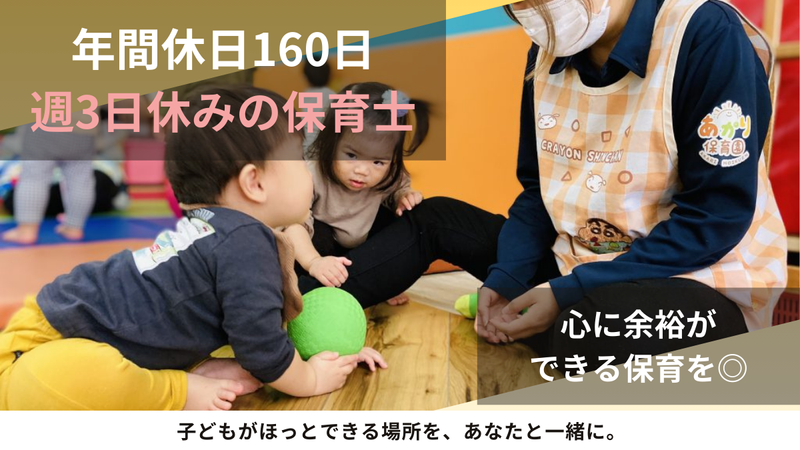 仕事内容 保育の仕事は好き。 でも、毎日バタバタして 気持ちに余裕が持てない。 そんな悩みを抱えている方に、 ぜひ知ってほしい職場です。 あかり保育園 東比恵は、 0〜2歳児・定員19名の 企業主導型小規模保育園。 さらに4勤3休・年間休日160日の働き方で、 体力面にも気持ちにも ゆとりを持ちながら 子どもたちと丁寧に関われます。 \働きやすさがちゃんと整っています/ ━━━━━━━━━━━━━━━━━━ ✨ 年間休日160日/4勤3休 …週3日休みでしっかりリフレッシュ ✨ 0〜2歳児×定員19名 …少人数だから一人ひとりに向き合える ✨ ICT活用で書類負担を軽減 …連絡帳や記録も効率よく進められる ✨ 持ち帰りほぼなし/残業ほぼなし …仕事と私生活のメリハリ◎ ✨ 東比恵駅から徒歩2分 …毎日の通勤もラクラク ━━━━━━━━━━━━━━━━━━ ▼主な業務内容▼ ━━━━━━━━━━━━━━━━━━ ・0〜2歳児の保育業務 ・保育計画の作成 ・ICTを活用した書類作成 (連絡帳・記録など) ・行事や制作準備 ・保護者対応 (送迎時の引き継ぎ、日々の共有 など) ▼1日の流れ(例)▼ ━━━━━━━━━━━━━━━━━━ 07:00 出社/受け入れ準備・園内整備 08:00 登園対応・自由あそび 09:30 朝の活動 (絵本・うた・製作など) 11:00 給食サポート 12:30 午睡チェック・連絡帳入力 (ICTで効率化) 15:00 起床・おやつ 15:30 自由あそび・お迎え対応 17:30 保育の振り返り・片付け 18:30 退勤 ※遅番シフトの場合は 引き継ぎ後、閉園準備を行い 20:00退勤となります ▼入社後のサポート▼ ━━━━━━━━━━━━━━━━━━ 最初からすべてを お任せすることはありません。 園の流れや子どもたちの様子を 知るところからスタートできます。 ⏩ まずは保育の流れを把握 ⏩ 先輩と一緒に保育補助から開始 ⏩ 少しずつ担当範囲を広げていく ⏩ ICTや書類も、 使い方や進め方を丁寧にフォロー ⏩ ブランク復帰の方も、 無理のないペースで慣れていけます この仕事の魅力(やりがい) ✨ 少人数だからこそ、 一人ひとりの成長を丁寧に見守れる →「昨日できなかったことが今日できた」 そんな変化に気づける環境です ✨ 0〜2歳の大切な時期に深く関われる → 成長の土台を支えるやりがいがあります ✨ 職員同士の距離が近く、相談しやすい → 困った時にひとりで抱え込まずに働けます ✨ 休みがしっかりあるから、 保育の仕事を長く続けやすい → 心身に余裕を持って 子どもたちに向き合えます ▼園について(特徴)▼ ━━━━━━━━━━━━━━━━━━ あかり保育園 東比恵は、 企業主導型の小規模保育園です。 0〜2歳児を対象に、 子ども一人ひとりと しっかり関われる保育を大切にしています。 ✨ 定員19名の小規模園 ✨ ICT導入で書類業務を効率化 ✨ 持ち帰りほぼなし・残業ほぼなし ✨ 人間関係の安心感を大切にした職場づくり