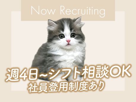 仕事内容 お任せするお仕事 ・2026年3月オープン予定!オープニング募集★ 新しい環境で立ち上げから関わり、キャリアも築けるチャンスです♪ ・充実した研修で基礎からじっくり学べる! オープン前までは既存のお店で研修&働けるので安心してご勤務できます★ ・週4日以上の安定シフトで稼げる ・直近3年で117名の社員登用実績有 ・基本は髪色自由であなたらしく働ける! <主な業務内容> 接客業務:お客様との会話を楽しみながらご案内 契約業務: ペットを迎えるお客様へのサポート 健康管理: 毎日の体調チェック、給餌 お手入れ:ふれあいながら耳掃除や爪切りなど 店内清掃:店舗やペットスペースの清潔管理 SNS投稿 :InstagramやHPの写真撮影 「○○さんに接客してもらえてよかった!」 そんな嬉しい言葉をいただけることも♪ 未経験でも安心の研修体制 本社の専任トレーナーはじめ、先輩が0からサポートします。 <研修内容> ・犬種/猫種の基礎知識 ・ペット用品の取り扱い ・接客の基本 ・契約業務の流れ 研修後は、実際に店舗で経験を積みながら少しずつ仕事を覚えていけます。 事前知識は一切不要です。 <オープン前について> 名古屋市内の店舗など、近隣店舗で勤務することも可能です♪ 勤務開始タイミングなどはご相談ください。 ある1日の流れ 09:00⇒店内・ペットのお部屋をお掃除 10:00⇒オープン!お客様対応&ペットのお手入れ 12:00⇒休憩(リフレッシュして午後も頑張ろう♪) 13:00⇒ペットを迎えるお客様の契約業務 15:00⇒ペットスペースのお掃除&お世話 16:00⇒接客や写真撮影など 18:00⇒退勤!お疲れさまでした ※一例となっておりシフトや店内の状況によって異なります 応募後の流れ [1]webまたはお電話にてご応募 [2]面接1~2回 [3]採用 応募確認後、お電話にて 勤務開始時期のご希望などを簡単にお伺いさせていただきます。 気になることがあれば何でも聞いてください◎ 不安を解消してから面接に進めた!と好評です。 ご応募いただいた方とは積極的にお会いしたいと考えており、 スピーディーな選考を心がけています! ※ご連絡がつかない場合、選考を終了させていただく場合があります ■面接について 面接では、「これまでどんなお仕事をしてきたか」や 「ペットが好きな気持ち」、「働くうえで大事にしたいこと」などをお聞きしています! 経験よりも、動物が好き・お客さまに喜んでもらいたいという気持ちを大切にしています。 難しい質問はないので、リラックスしてお越しください♪