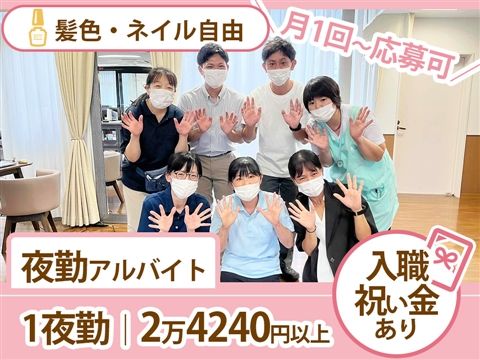 入職祝い金あり◎《シニア雇用促進求人》月1回~応募可◆1夜勤2万4240円以上☆経験者はならし日勤無し♪全34床の施設で2名体制の夜勤です【北伊丹駅、伊丹市、有料老人ホーム、介護職(シニア)、夜勤アルバイト】