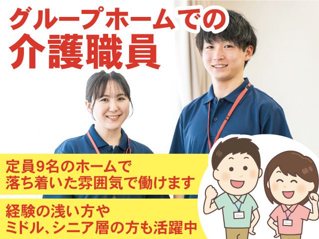 仕事内容 定員9名のグループホームでの介護職員 【おすすめポイント】 ・週2日~勤務OK ・週4日でしっかり稼ぎたい方も大歓迎 ・曜日固定可能 ・長期休みや曜日希望などシフト相談OK ・ミドル、シニア層の方も活躍中 ・車通勤OK ・職場見学OK 小規模ホームなので、 負担が少なく、体力的にも安心です。 また、落ち着いた雰囲気で働けますので、経験の浅い方やブランクのある方にもオススメです 【お仕事内容】 グループホームでの介護・生活支援 ・起床時、就寝時のお手伝い ・お食事の準備や配膳 ・服薬、入浴、排せつの介助 ・体操、外出、歩行練習、余暇活動の支援 など あくまで主役は入所者ご本人です。 ご本人の活動を上手に支援していきます。 土日どちらかできる方大歓迎です。 平日は銀行や病院に行きたいので、土日どちらか出勤したい。 というスタッフさんもいらっしゃいます。 ゆっくりと介護業務を行いたい タイムスケジュールにしばられすぎず、しっかりご入居者様と向き合いたい 資格はあるけど、経験が浅いので不安 そんな方も、先ずは当施設に見学に来てみてください。 ここまでご覧いただきありがとうございます。 お気軽にご応募ください。