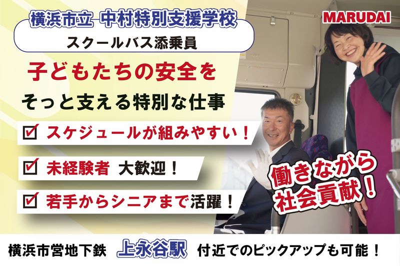 【仕事内容】 ■仕事内容 特別支援学校の通学バスサポートスタッフとして、生徒様をバス送迎補助していただきます! \特別支援学校の通学バスサポートスタッフの働きやすさ/ ◇スケジュールが決まっている◇ 送迎スケジュールはもちろん、学校の予定に合わせてお休みも決まっています! ◇毎日同じルートで運行◇ 観光バスのような異なるルートはありません!一度覚えてしまえば楽々です! \現在募集中のルートはこちら/ ・中村特別支援学校 住所:神奈川県横浜市南区中村町4-269-1 お近くにお住まいの方は、運行ルート付近(上永谷駅)でのピックアップも可能です。 ■1日の流れ(例) (登校便) 7:00 各バス停を周り、生徒様を順番にお迎えします。 ↓ 9:00 学校に到着。生徒様を先生に引き渡します。 (下校便) 14:00 学校に到着。生徒様をお乗せし、各バス停を周ります。 ↓ 16:00 生徒様を全員送り届けたら送迎は終了です。営業所に帰庫します。 \スクールバスならではの休憩時間の使い方/ ◇休憩は5時間!使い方は自由!◇ ・ご自宅に帰って家事や趣味の時間に充てる ・平日昼でも役所や病院/歯医者へ ・布団を持ち込んでお昼寝 ・近くのスポーツジムでトレーニング ・Wワークで副業も自由 ■活かせる資格・経験 経験は一切問いません!どなたでも未経験からスタートできるお仕事です! 【福祉/保育に関わるお仕事の経験がある】 【福祉/保育系資格を持っているけれど今は活かせていない】 という方も大歓迎です! また生徒さんとの関わり方は学校と保護者の方が特性に合わせて決定します。 一人一人に向き合ってお仕事をしたいという方におすすめです! ■こんな方におすすめ ◇年齢を気にせず働きたい方◇ ・若年層から中高年シニアの幅広い世代が活躍中! ・さらに男女問わず活躍中! ◇時間を確保したい方◇ ・決まったスケジュールで、家庭との両立をしやすい! ・夏休みや冬休みなど、お子様の休みに合わせた休暇をとれる! ◇好きなことに関わりたい方◇ ・生徒さんや親御さんの笑顔/成長を見届けられる! ・元保育士で子どもが好き、元看護士で誰かの力になりたいなあなたに! ◇地元が好きな方◇ ・転勤なく、地元で働き続けることができる! ・決まった近隣エリアのみの運行で、地域に密着! ■入社後の流れ <1日目> まずは座学や動画マニュアルで、業務内容をじっくりと理解していただきます。 ※状況に応じて、午後の下校便に実際に同乗し、業務を見学いただく場合もあります。 <2日目~6日目> 専任の指導員がサポートしますので、実際に業務をこなしながら、仕事に慣れていただきます。 <7日目以降~> 正式に現場での業務をお任せします。 ※毎年春・夏と全社研修もあります!今年の夏研修は8月下旬に実施予定です。 ■働きやすい環境づくり ◇賞与は年2回支給◇ ◇転勤なし◇ 転居を伴う(県をまたぐ)異動は一切ありません!入社時に希望の拠点をお伝えください。 ■安全への取り組み 命を預かる事業者として安全性の向上へ日々取り組んでおります! ◇最新設備の導入◇ 最新の安全技術、PCS、VSC装備車両を随時導入して 走行状態を検知して危険を抑止しています。 ◇健康チェック◇ ドライバーの睡眠時無呼吸症候群の可能性を事前にチェックして 安全運行に役立てています! =================== 創業102年 ~大正生まれの実績と伝統ある企業です~ 長い歴史と伝統がある当社ですが、新しい風も常に取り入れています! 安全への取り組みも積極的! 風通しの良い職場なので ぜひあなたの意見などもどんどん聞かせてください。 一緒に「より良い会社」にしていきましょう! =================== \まずはお気軽にご応募ください/ ご経験の活かし方や、ライフスタイルに合わせた働き方などまずはご相談ください! 少しでも気になったら、ご応募をお待ちしております! ★リファラル採用実施中★ 知人や友人を紹介し、採用が決定すると、 紹介者に10,000円、入社者にも10,000円を支給します!
