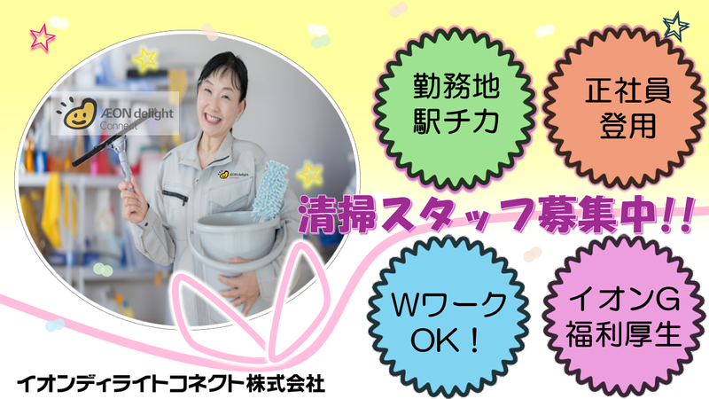 仕事内容 面接確約・イオングループの福利厚生制度あり|主婦(夫)・学生・フリーター活躍中|マックスバリュエクスプレス勝川駅の清掃スタッフ|アルバイト・パート|東海支店 早朝のおしごと、嬉しい駅チカ現場! シフト相談はお気軽に ! 扶養内・Wワーク・短時間OK ! サポート & フォロー体制充実 ! 未経験 & ブランクからの挑戦も安心 ! イオングループの従業員を対象とした福利厚生制度あり ! マックスバリュエクスプレス勝川駅店で清掃業務をお任せします。 ・トイレの清掃(壁面除塵、便器洗浄、洗面周り清掃、床面清掃、備品補充など) ・ハンディ掃除機などを使用した床清掃 ・床面のモップ拭き ・ゴミなどの回収 ・外周の拾い掃き清掃 ・リサイクル回収 <勤務開始の流れ> 清掃のお仕事がはじめての方も安心! 充実のサポート&フォロー体制でお迎えします! 専門知識は必要なく、カンタン・シンプルな清掃作業です! お仕事の流れや作業方法などは、お仕事スタート時にしっかりレクチャーいたします! <職場環境> 主婦・大学生・フリーターをはじめ、40代・50代のミドル世代や、60代~のシニア世代など幅広い世代が活躍中です。 プライベートはもちろん、家事や子育て、学校やWワークなどと調整しながら働きやすい環境です。 わからないことなど、みんなで助け合いながら作業を進めています! アピールポイント スキマ時間で多彩な働き方を実現 ! 子育てが一段落したからパートをはじめようかな ? 週末や、授業のないスキマ時間でバイトをしたい ! Wワークでカケモチできるバイトを探している。 という方、まずはご希望のシフトスタイルをお伝えください ! 主婦(夫)の方は、扶養内などの調整もご相談いただけます。 フルタイムでしっかり稼ぎたい ! という方も、ぜひご応募ください ! カンタンなお仕事だから、未経験でも安心 ! キレイ好き & お掃除好き ! な方にオススメなお仕事です ! 経験はなくても大丈夫 ! モップ掛けや、ごみ回収などシンプルな軽作業なので難しい事はありません ! お客様が快適にお過ごしいただける環境を一緒につくりませんか ?