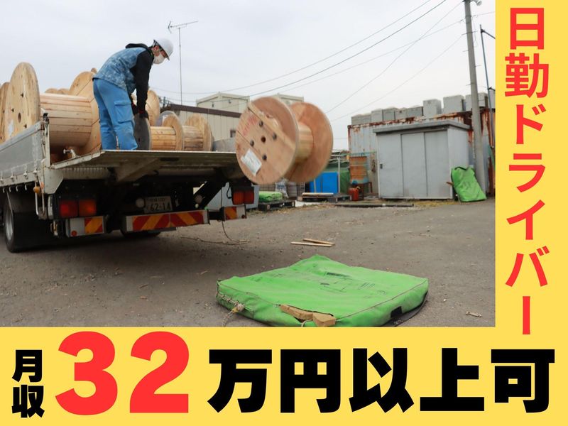 求めている人材 要普通免許(取得後2年以上) ※中型車運転できる方は尚可 ー ★入社して半年間、普通免許で乗れる車両で仕事をしながら中型免許取得に向けて勉強し、無事に免許をゲットしている方も活躍中! 免許はあるけど、実務未経験の方やブランクがある方は運転の仕方やコツなどサポートしますよ! ★ほぼ全員が未経験スタート! →まずは積み方・結び方から研修でお教えします。 早ければ2週間ほどで独り立ちする人も!長くても1ヶ月ほどで一通り習得できます。 【入社1年目のスタッフより】 運転中は好きな音楽をかけて、ドライブ気分です。 運転中は一人で気楽だし、会社に戻ってもみんな温かく居心地がいいです。 その上、月35万円稼げているので、とても働きやすいです。(中型免許所持者・4t車担当) 【「続けている理由」聞いてみた】 ★人間関係が良いから、居心地がいい ★仕事さえちゃんとこなせば、外での動き方は任せてもらえる!信頼されてるって感じ! ★慣れたら一人で作業するので、気楽♪ ★積み方やロープの巻き方など分からないことがあれば常に電話で聞きやすい状況になってて、安心◎ 【スタッフの前職は?】 ・土木作業員 ・自動車製造 などなど 【木製ケーブルドラムについて】 電気を通すのに必要な電線ケーブルは、何十メートルもの長さです。 そのケーブルを運ぶ時に使うのが「木製ケーブルドラム」。 ミシン糸の芯(ボビン)のような形で、電線を巻き付けて使う土台の部分です。 小型サイズから最大300kgのものまで、様々な種類があり、10kg以上のものはフォークリフトを使用して積み降ろし。 10kg満たないものは荷台近くまで転がして運んでいます。 積み方や、移動中の安全な固定方法などもしっかりと教えます。事故が起きないよう、しっかりと学びながら安全運転で届けることを大切にしてくださいね。 年齢の条件と理由:あり(例外事由3号のイ・41歳未満(長期勤続によるキャリア形成のため))