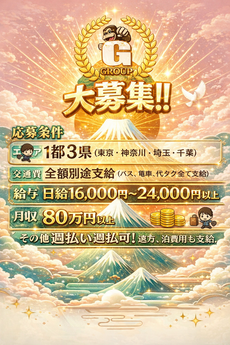 仕事内容 ▼給与 日給16,000円~24,000円(交通費別)♪ ・2時間~4時間以内の業務で8,000円~16,000円 ・人工割りや2現場で午前中でも16,000円も可能 ・1時間以内8,000円の現場も多数あり ・ダブルや人工割りで日給24,000円以上も可能 ・1日出勤が可能ならば、毎月30万円~70万円以上 ▼交通費 ※交通費は2現場、3現場回っても全額支給 ▼エリア ※関東を中心として様々なエリアに電車又は新幹線で向かいます。(遠方の場合1時間ごとに遠方費も付きます。) ▼勤務時間 8:00~15:00(1現場・実動2~6時間) ・午前や午後だけもOK! ・フル1日出勤でもOK! ・夜勤の仕事もあり(通常の25%増) ※シフトは1週間ごとに提出、3日以内であれば変更可能 ※週1日~、土のみ勤務もOK ▼勤務例 (1)8:00~17:00(2現場・実動7~8時間)16,000~24,000円 (2)8:00~12:00(1現場・実動2~4時間)8,500〜16,000円 (3)13:00~17:00(1現場・実動2~4時間)8,500 〜16,000円 ▼休日 日曜 ▼その他 ・週払い日払い月払い可能 ・3年以内には2時間~4時間以内の荷揚げ作業で1現場、10,000円~20,000円にお給料UP♪ 荷揚げ屋ジーグループ ◇本社:東京都新宿百人町3-30-2-717 最寄り駅:大久保駅 ◇千葉:千葉県印西市高花2-3-2-503 最寄り駅:千葉ニュータウン中央駅