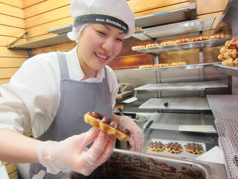 仕事内容 / 未経験大歓迎! \ 生地からワッフルを焼いてチョコなどをトッピング☆ レジや箱詰めなどもみんなで協力しあいながら行います! トッピングは綺麗且つスピーディーにするのがポイント! 慣れるまでは先輩スタッフがしっかりサポートします◎ 少しずつ上達していければOKなので未経験の方も安心してご応募下さい! 3ヶ月ほどで1人前に♪ ================== ・。☆(人'▽')気になる職場環境*大公開 ================== ★全員がお互いに気を遣うことなくのびのび・イキイキ活躍中! ★コンパクトなお店なので、わからないこともスグに聞ける! 普段は3~4名程のスタッフで製造と接客を行っています! 少人数制なので「スタッフが多いとコミュニケーション取るの大変…」なんて事はありません♪ それぞれに役割をもって勤務できるので、余計なことは考えずに自分のポジションをシッカリこなしたい派の方にピッタリです!
