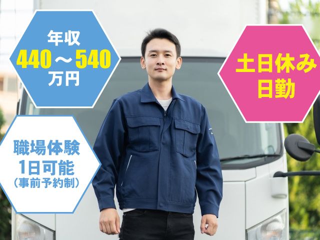 月給340,000円~450,000円 給与 月給340,000〜450,000円 入社後の推定年収 4,400,000円~5,400,000円 【充実の手当一覧】 ◆賞与年2回(1~1.5ヶ月) ◆社会保険完備(雇用保険、労災保険、健康保険、厚生年金保険) ◆家族手当 ◆食事手当(中・長距離の場合) ◆ノーミス手当 ◆ワンマン手当 ◆リーダー手当 ◆資格取得費用半額補助(準中型・中型・大型・フォークリフトの免許取得費用の50%支給) ◆交通費支給(当社規定)