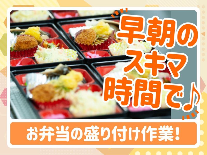 仕事内容 ✅ コツコツ&モクモク作業が好きな方にピッタリ! ✅ 早朝2.5時間だけの盛り付け作業 ✅ Wワークや扶養内勤務もOK! 【詳細なお仕事】 ラインコンベアからお弁当の容器が流れてくるので、 1人一品、盛り付ける…やっていただくのはコレだけ! 一つの事に集中して取り組める方にピッタリのお仕事です! 力仕事を伴う事もありません! 6時からの2.5hのお仕事なので、 本業とかけもちしたい方や「早起きは三文の徳♪」感覚で お小遣い稼ぎしたい方にピッタリ♪