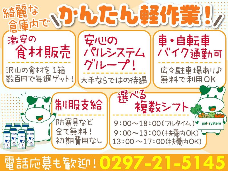 仕事内容 ╭━━━━━━━━━━━━━━━━━╮ ✨新センターOPEN!スタッフ大募集✨ ╰━━━━━━━━━━━━━━━━━╯ \電話応募・メール応募どちらも大歓迎/ 気になった方はお気軽にご連絡ください♪ ▶ TEL:0297-21-5145 ◆ 週2日~勤務OK! (日・祝入れる方歓迎) ◆ 家計にやさしい社内販売あり (冷凍食品など) ◆ ライフスタイルに合わせて選べるシフト ◆ ロッカー・休憩室完備のキレイな職場 ◆ 車・バイク・自転車通勤OK ◆ 防寒着や安全靴など無料支給 ◆ 安定のパルシステムグループで長期安心! ⋆・───・⋆・───・⋆・───・⋆ 【仕事内容】 倉庫内での出荷準備をお任せします。 扱うのはパルシステムの冷凍食品など。 「組み立てて → 入れる」 だけのシンプル作業! モクモク集中したい方にもピッタリです◎ ▽主な業務内容 ・商品のピッキング ・セット作業 ・梱包・確認作業 ⋆・───・⋆・───・⋆・───・⋆ ✨ここがポイント✨ ✅キレイで快適な新倉庫 更衣室・ロッカー完備で安心! ✅お得な社内販売 人気の冷凍食品を スタッフ価格で購入OK! ✅自由度高めのシフト制 9時~・13時~など、 あなたの都合に合わせて働けます!