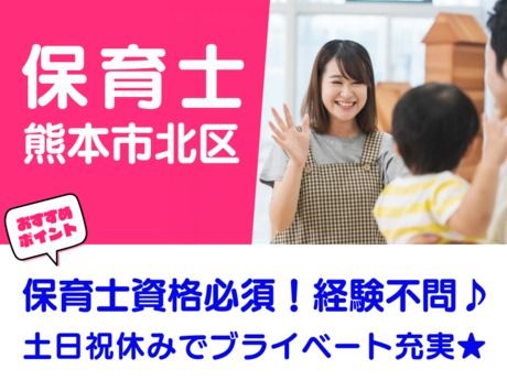 仕事内容 \ここがポイント/ ★保育士資格必須!経験不問でどなたでも挑戦できる♪ ★土日祝休みでワークライフバランスも◎ ★熊本県熊本市北区西梶尾町での保育士業務! *・。・。*・。・。*・。・。* <仕事内容> \★未経験歓迎!保育士資格を活かして子どもたちをサポート★/ 保育園で、子どもたちの日常生活をサポートし、成長を見守るお仕事です。 ・食事やお昼寝の準備、見守り ・遊びや学びを通じた成長サポート ・保護者との連絡や相談対応 保育士資格があれば、経験は不問!土日祝休みなので、働きやすい環境です。 *・。・。*・。・。*・。・。*