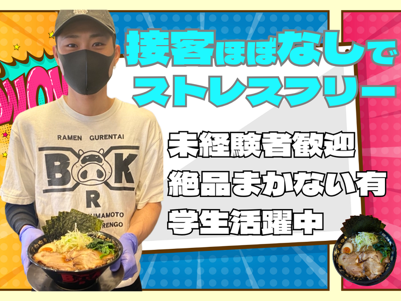 仕事内容 / お昼のキッチン新メンバーを急募だぜ⭐ 平日のみ、土日祝休みシフトもOK! 初バイト・接客未経験でも積極採用中! 2026年3月末までの短期もOK! \ 【主な仕事内容】 ・材料のカット ・仕込み ・調理 など こだわりのラーメン作りや、 調理にかかわる業務をお任せしていきます!