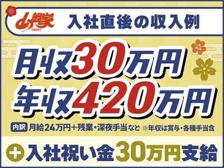 仕事内容 【上場企業×全店直営】キャリアUPを目指す方必見! 業界屈指の安定基盤を誇る《丸千代山岡家》で、 「1~2年後に店長」を目指して働きませんか! *店長・ミドル店長:月給41万~60万円 【飲食経験者歓迎】※ジャンル不問 ★ラーメン屋の経験がなくても大歓迎です!! ====================== 【中国・九州・関西・中部エリアでも続々出店中】 2026年4月3日、香川県に「高松中央インター店」が オープン予定!!四国初進出です! 2025年10月には、 和歌山県2店舗目「岩出店」もオープンしました! / 成長加速&エリア拡大中に伴い、 正社員を“積極採用中”!(2024年実績:180名以上) \ 【スムーズに業務を始めていただくために…】 入社後は、茨城県つくば市にある自社の トレーニングセンターで研修を実施(3泊4日) ※研修中の交通費・宿泊費は全額会社負担! ※研修中もしっかり給与支給で安心スタート ====================== \ オススメPOINT 1 / 【東証スタンダード上場企業の安定基盤】  ̄ ̄ ̄ ̄ ̄ ̄ ̄ ̄ ̄ ̄ ̄ ̄ ̄ ̄ ̄ ̄ ̄ ̄ ̄ ■今なら!入社祝い金30万円支給!! ■残業代は1分単位で全額支給(みなし残業なし) ■昇給・賞与は年2回!! ■特別休暇を合わせて、実質年休111日! ■有給平均取得日数7.5日(土日取得もOK!) ■プライベート都合でのシフト希望休・連休も可 ■男性社員の育休取得実績もあり! \ オススメPOINT 2 / 【最短1年で「店長」へキャリアアップ可】  ̄ ̄ ̄ ̄ ̄ ̄ ̄ ̄ ̄ ̄ ̄ ̄ ̄ ̄ ̄ ̄ ̄ ̄ ̄ ̄ 頑張りがそのまま昇進に繋がるのが “山岡家”。 評価制度が明確で着実に仕事を覚えられるから、 未経験者も3年で店長になる社員が多数! ★経験者なら、よりスピード昇進が可能!! ====================== 《昇進例》 ◆一般社員・・・・・【年収420万円/月給24万円】 ◆アドバンス社員・・【年収470万円/月給28万円】 ◆店長・・・・・・・【年収560万円/月給41万円】 その後もエリアマネージャーや幹部候補、 本社スタッフ、スーパーバイザー(SV)など、 多彩なキャリアパスをご用意してお待ちしています! 【お仕事について】 ゆくゆくは店長として、 アルバイト採用やスタッフ教育などの人材育成、 売上・利益率の管理、月次損益書の作成、 自店舗の目標達成に向けた運営戦略の立案・ 実行などをお任せしたいと考えています! <入社後の流れ> まずはホール業務からスタート! お店全体の流れや雰囲気をつかみます。 ▼ キッチン・洗い場・仕込みなども習得! 冊子のマニュアルや、店舗タブレットでも 視聴できる動画教材があるのでスムーズ! ▼ 店舗全体の流れを理解したら、 スタッフ育成や売上管理、発注業務など 店舗運営の中核を担うポジションへ。 ▼ 店長として、運営業務を一任します! ※接客・マニュアル・動画はすべて日本語です。 ・・・・・・・・・・・・・・・・・・・・・・ <店長インタビュー:30代・男性・ミドル店長> ・・・・・・・・・・・・・・・・・・・・・・ Q.【山岡家に入社した決め手は?】  ̄ ̄ ̄ ̄ ̄ ̄ ̄ ̄ ̄ ̄ ̄ ̄ ̄ ̄ ̄ ̄ 店長に店舗運営を任せるスタイルなので 幅広い経験ができると考えて、店長を目指して入社。 セントラルキッチンを持たずに、 仕込みからすべて店舗で手作りしている 山岡家のラーメンが大好きだったことも理由です! 評価基準も明確で、頑張れば頑張った分だけ しっかり昇進できるのも山岡家の魅力だと思います。 Q. 【店長としてのやりがい、心掛けていることは?】  ̄ ̄ ̄ ̄ ̄ ̄ ̄ ̄ ̄ ̄ ̄ ̄ ̄ ̄ ̄ ̄ ̄ ̄ ̄ ̄ ̄ ̄ ̄ ̄ 人を育てて“強い店”をつくることが一番のやりがい! 特に、新店に異動するとゼロからのスタートなので 大変さもありますが、立ち上げから任せてもらえる 責任とやりがいは大きいですね。 心掛けているのは、スタッフたちと積極的に関わり、 楽しく働けるようコミュニケーションを取ること。 スタッフと一緒に成長できる職場を整えることが、 店長としての重要な役割だと思っています。 <異動も “キャリアアップ” のきっかけに!> 週休2日制の正社員には全国転勤がありますが、 「異動=ただの配置換え」ではありません。 新しい環境で視野が広がり、経験の幅も広がることで 昇進・評価につながるチャンスになります! <転勤や異動の際も安心の制度あり!> ■全国への転勤費用・引越し費用は全額会社負担! ■異動に伴う帰赴任手当なども全てサポート! 【丸千代山岡家について】 全国に190店舗以上のラーメン店を運営中。 売上好調!前年比平均10%以上の成長率! 47都道府県への出店を目指し、新店OPENも続々。 セントラルキッチンを設けず 全店直営&店内手作りにこだわる姿勢で、 根強いファンもたくさんいます! リピート率はなんと75%超え!(自社調べ) <売上高> 186億7600万円(2023年1月期) 264億9400万円(2024年1月期) 345億8500万円(2025年1月期)*前年比130.5%! 《HP》https://www.yamaokaya.com/ 《採用HP》https://recruit.yamaokaya.com/