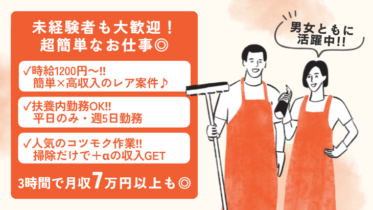 仕事内容 \ 未経験も大歓迎 / 【仕事内容】 ・トイレ、床清掃 ・ゴミ出し、回収業務 など をお任せします! _________ | ⭐未経験でもOK |  ̄ ̄ V  ̄ ̄ ̄ ̄ ̄ ̄ 難しい作業は一切ないので、 未経験でもスグに活躍することができます! 初めは分からないことだらけだと 思いますが、初めはしっかり 先輩スタッフがサポートしていくので ご安心してください♪ 分からないことがあったら 周りの先輩スタッフに 聞いてくださいね☆ ________ | ⭐適度な運動に |  ̄ ̄ V  ̄ ̄ ̄ ̄ ̄ 体を動かしながらのお仕事に なるので、お仕事をしながら 「体を動かしたいなぁ」 「適度な運動になるなら」 なんて方も大歓迎★ 在籍スタッフからも運動になる! と好評です♪ ____________ | ⭐プライベートも充実 |  ̄ ̄ V  ̄ ̄ ̄ ̄ ̄ ̄ ̄ ̄ 週5日、1日3時間の勤務なので 体への負担は少なめ! スキマ時間を活かして家事や育児と 両立しながら働いている主婦さんや Wワーカーさんが多数活躍中です♪ 【求人番号7136】