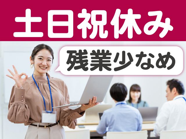 仕事内容 人気の土日祝休み&オフィスワークです! まだまだ増員募集中! 事務未経験でも大丈夫! パソコンの基本操作ができれば問題なし! ◎残業少なめ ◎土日祝休み ◎長期連休もあり <一般事務スタッフ> 製造事務所での書類の整理やデータ入力をお任せします。 現場より上がってきた書類などを専用のシステムやExcelを使用して入力する作業です。 来客対応はほぼありませんが、電話対応は多少あります。 電話対応のほとんどが社内スタッフとのやり取りのため、事務初心者さんも安心です! パソコンの基本操作が出来れば、事務経験は問いません。 難しい作業はありませんので、すぐにお仕事に慣れることができますよ <基本は定時退社です> 残業はほとんどないので、基本定時で退社できます。 家庭やプライベートとの両立がしやすい環境です。 20代・30代の女性が活躍しています。 <未経験スタートOK> パソコンでの入力など基本操作が出来ればOK! 事務未経験の方にも、丁寧にお教えします。 教育にはしっかり時間をとるのでご安心ください。 事務未経験の方もじっくり仕事を覚えていける環境です。 \働きやすいポイント/ 残業がほとんどないので、ライフワークバランスを充実させたい方にもピッタリ。 GWやお盆、年末年始などの長期連休もあります。 平日はしっかり勤務、お休みの日は自分の時間や家族との時間を大切にできます。 お子さんがいらっしゃる方も、学校のお休みに合わせて予定が立てやすいですよ! (月初や月半ばに若干残業の可能性あり)