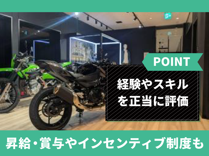 仕事内容 自分の仕事に誇りを持ち、 愛着のある一台を完璧に仕上げる。 そんな整備士としての本質的な 喜びを感じてみませんか? Kawasaki正規ディーラーとして、 最新鋭の設備と「五感で楽しめる空間」 を整えた新しい店舗で、あなたの 経験を存分に発揮してください。 1日2〜3台という余裕のある 作業環境だからこそ、 細部まで徹底的に向き合える。 バイクが好き、その純粋な気持ちを 大切にできる場所がここにあります。 【アピールポイント】 *1日2〜3台を丁寧に。一台と向き合う最高の整備環境! *2月に新店舗へ移転予定!最新の設備で働ける絶好の機会! *残業は原則なし!仕事終わりの時間を大切にできる働き方! *Kawasakiによる専門研修!正規ディーラーの技術を習得! *月給は最大50万円!経験を正当に評価する給与システム! ////////////////// <電話でのお問い合わせ> 042-520-3313(採用担当)まで ////////////////// 【仕事内容】 Kawasakiブランドの正規ディーラーでの整備士として、整備・点検・メンテナンス、消耗品の交換、見積書作成などを行います。 <具体的には> 〇定期点検および一般整備: 6ヶ月点検などの法定点検を中心に、消耗品の交換やエンジンのメンテナンス、不具合箇所の特定と修理を行います。 〇お客様へのご説明・見積作成: 点検の結果や必要な修理内容をお客様へわかりやすくお伝えし、見積書や関連書類の作成業務を行います。 〇最新システムの活用: 独自のチェックシステムを用いて点検を行うため、作業漏れを防ぎ、確実な品質を提供できる体制が整っています。 <入社後のサポート> 入社後は、親会社であるKawasakiが主催するWEB研修を受講し、正規ディーラーとしての基礎知識を習得することから始めましょう。 店舗配属後は、洗車や基本整備からスタートし、約3ヶ月かけて技術のベースを構築します。 自信を持ってお客様対応ができるよう、先輩スタッフが丁寧にサポートします。 ////////////////// 【一台に情熱を注げる環境】 ここでは1日に担当する車両を2〜3台に限定しています。効率だけを追い求めるのではなく、一つひとつの工程にこだわり、お客様の安全を支える「職人」としての誇りを持って作業に没頭できるのが最大の魅力です。最新鋭のテクニカルセンターとして機能する新店舗で、自身の整備技術をさらに高めたいという方に最適な環境をご用意しています。 【自分自身も楽しめる職場に】 職場にはカワサキのマシンをこよなく愛するスタッフが集まっており、休憩中や仕事終わりには共通の趣味で盛り上がることもしばしばです。また、店舗が主催するツーリングやサーキット走行会などのイベントには、自身の愛車で参加することも可能!お客様と一緒になってモーターサイクルライフを楽しみ、その熱量を整備の質へと繋げていける環境です。 【私生活を犠牲にしない働き方で】 基本的には定時退社を推奨しており、残業はほとんど発生しません。遅くなったとしても19時までには退勤できるため、家族と過ごす夕食の時間や、趣味に費やすプライベートの時間をしっかりと確保できます。 毎週火曜日と第3水曜日の定休日に加え、希望休も取得できるため、ワークライフバランスを重視して長く安定して働きたい方にお勧めです。 【正規ディーラー勤務の安心感】 福利厚生も正規ディーラーならではの充実度を誇ります。 昇給や年2回の賞与、インセンティブ制度により、日々の努力を給与として還元。 資格取得支援制度も完備しているため、さらなる上位資格への挑戦も積極的に後押しします。 また、社員割引制度を利用してパーツの購入や車両のメンテナンスができるのも、バイク好きには嬉しいポイントです。 ////////////////// ー 当社について。 「五感で楽しめる空間」をコンセプトとするショールームを展開しています。店舗デザインや展示スタイル、音楽・香り・味覚まで調和された独自の世界観でお客様をお迎えします。お客様に安全で楽しいモーターサイクルライフを提案するテクニカルセンターとして、様々なブランドとのコラボレーションも実施しています。