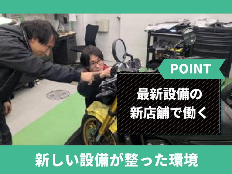 職場環境 バイクを愛するスタッフによるチームワークが自慢!経験年数や社歴を問わず、意見交換が活発に行われる風通しの良い職場です。2月の新店舗オープンに向けて、一丸となって取り組む活気溢れる環境。整備の腕を磨きたい方、専門知識を深めたい方を全力でバックアップします。
