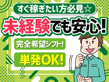 仕事内容 \単発OK!副業にピッタリ♪/ 働いた次の日にお給料GET♪ 「単発で働いて、気に入れば長期で働きたい」⇒大歓迎! \こんなお仕事です/ ベビーアパレル用品の倉庫内で、 ・コンテナデバンニング作業 ・ピッキング作業 ・ベビー用品(服等)の入った段ボールをコンテナから取り出すお仕事 シンプル作業なので、あっという間に時間がたちます◎ 未経験の方も大歓迎! 先輩スタッフが丁寧に指導するので、安心してスタートできます。 少しでも興味を持ったら、ぜひお気軽にお問い合わせください! 応募を迷っている… もっと詳しく知りたい… そんな方も大歓迎です! ご応募、心よりお待ちしております! <Q&A>入社までの流れについて Q. 応募してからどれくらいで働けますか? A. 応募から入社までは、1週間~通常2週間以内の現場が多くなっています。 Q. 急いで仕事を始めたいのですが対応してもらえますか? A. 即日面談やスピード対応が可能な案件もご案内可能! ご希望をお伺いして、最短で就業できるお仕事をご紹介いたします。 Q. 他の仕事と比較してから決めたいのですが、相談だけでも可能ですか? A. もちろん可能です。 複数の選択肢をご提示しながらご案内します! <Q&A>収入について 【お給料の支払いについて】 Q. 日払いは対応していますか? A. はい、日払いに対応しています。 前日の11時までに申請⇒当日の夕方までにお給料をお受け取りいただけます。 Q. 夜勤の場合でも日払いは可能ですか? A. はい、夜勤後も対応可能です。 お仕事終了後、朝11時までに申請⇒その日のうちにお給料をお受け取りいただけます。 Q. 前払い制度はありますか? A. ご利用可能です。 詳細は勤務先や就業形態によって異なりますので、ご相談時にご希望をお伝えください。 Q. 申請方法は難しいですか? A.どなたでもスムーズにご利用いただけます。 スマートフォンやPCからの申請も可能です!