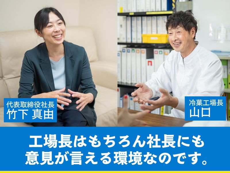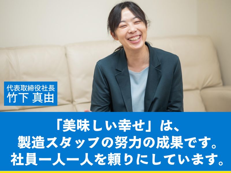 仕事内容 【ブラックモンブランを作る老舗!】 九州エリアではお馴染み、 ブラックモンブランなどのアイスを 作る仕事です。 九州エリアはもちろん 全国から募集します! みんなに愛されるアイスを 一緒に作りませんか? - 【竹下製菓はどんな会社?】 創業は1894年。 佐賀は、長崎から続くシュガーロードと 言われています。西洋菓子の文化が伝わり、 独自に発展したエリアです。 まだクーラーもなかった時代のこと、 夏場になると甘いお菓子の売れ行きは 鈍りました。そこで 「夏はアイスキャンディーだ!」と 三代目社長の竹下小太郎が 1958年からアイス部門を設立。 数年後には機械メーカーと国産第1号となる オートメーションのアイスバー製造機が完成。 自慢の味をどんどん 世に送り出せる体制が整いました。 - 【ブラックモンブラン、全国へ!】 その後、三代目がヨーロッパ旅行の際、 雪の積もったモンブラン山の美しさに感動。 「あの山にチョコをかけて食べたい!」 と帰国後に開発して生まれた 「ブラックモンブラン」が大ヒット。 現在も九州エリアではソウルフード。 56年愛されるヒット商品となりました。 人気アニメとコラボした 「ブラックモンブラン」が全国のコンビニで 展開するなど新たなファン層も獲得。 「え!あのアイス作っているの!?」と 周りから驚かれ、誇らしい気持ちになれる 仕事になると思います。 - 【具体的な仕事内容は?】 1日25〜30万個のアイスを製造。 基本的には自動化です。 データの記録、機械の操作や 殺菌洗浄などが主な仕事です。 「今日はミルクックを20万本!」など 作るものは、生産スケジュールにより 変わります。 - 【想定される役割は?】 まずはモノづくりの一通りの流れを 知ってもらうために、順番に全ての 工程を体験してもらいます。 その中から工場長と相談しながら、 「この仕事が楽しい」 「これを極めてみたい」などを考慮し 役割をお願いしていきます。 気がつけば、工場の中核を担っている という状態になってもらうのが理想です。 - 【向いていない人は?】 ・業務に線引きしてしまう方 ・チームワークが苦手な方 ・他責の方 ・素直にやってみる!ができない方 ・感謝力がない方 - 【働き方・雇用条件】 勤務地:冷菓工場 雇用形態:正社員 試用期間:あり(4ヶ月) - 【一緒に働くと、こうなります】 ●誇らしい気分になれる。 商品や広告を見かけるたび 「このアイスは自分が作ったんだ!」と。 ●毎日アイスが食べ放題(無料) ●老舗企業の一員としての安定した生活 ●頑張りはしっかりと評価します。 工場長は二人ともアルバイトから出世 *-*-*-*-*-*-* 【少し長めのメッセージ】 最後に・・・ 社長の想いや歩みを語ります。 少し長いので、お時間がある時にどうぞ! 「ブラックモンブラン」の社長って こんな人らしいよ? と話のネタにもなると思います。 *-*-*-*-*-*-* 【社長はどんな人?】 五代目社長の竹下真由です。 ブラックモンブランを作ったのは 三代目だった私の祖父です。 昔はお菓子工場に併設した家に 住んでいたので、お菓子づくりには 幼い頃から触れてきました。 地域の小学校の運動会には、 アイスを差し入れ。 (今も続いています) 祖父は家の台所でも深夜まで 新商品の試作をしていて 機械いじりの得意な父がそれを 工場で大量に作る。そういう姿を 見ながら育ちました。 お菓子づくりを祖父に習い、 父から工作や日曜大工を習いました。 - 【ロボットやコンサルを学んできました!】 そんな私ですから、テレビで ロボットコンテストを見て大興奮。 「これがやりたい!」と思い立ち、 大学はロボットづくりに没頭しました。 卒業後は超ハードな環境で、成長できそうな 外資系のコンサルティング会社に入社。 …実は仕事のできるパートナーを捕まえ 実家の佐賀に一緒に帰る、という 裏目標もあったんですけど(笑) そしてがむしゃらに働き、 30歳の頃に同期入社の夫と結婚。 それを機に実家に戻ることになりました。 その後、夫も私の会社に合流。 2016年には、社長を引き継ぎました。 - 【快進撃から一転、一人経営に…】 そこから8年、会長となった父と 外資系コンサルで腕を磨いた私たち夫婦の 3人チームで、仕組みやルールの見直し、 DX化など様々な改革を進めていきました。 グループ会社も9社に増え、事業も順調に 拡大していきました。 2024年1月、副社長として 忙しく飛び回っていた夫が ある日、突然、くも膜下出血で倒れて他界… その3ヶ月後には、高齢だった父も他界… いきなり一人ぼっちにされた感覚でした… ですが、悲しむ暇もなく、社員を、会社を、 守らなくちゃと必死でした。 私には三人の子どもたちもいます。 - 【そうだ、頼れる社員たちがいる!】 …ですが、気づいたのです。 一人で出来ることには限界がある。もっと 社員のみんなに頼ればいいんじゃないか… そこからは、 これはこの人に、あれはあの人に、と どんどん社員の得意なことをみながら 任せていく方針に切り替えました。 するとどんどんアイ