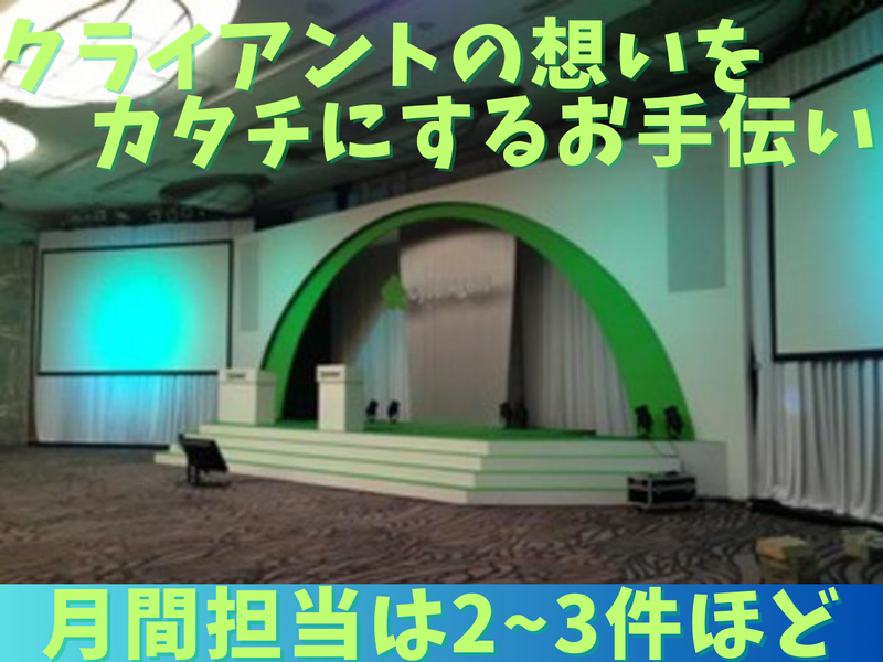 仕事内容 各種イベントや展示会など、 多くの人が訪れる空間を クライアントの考える目的やイメージを 数字、形にするために、 入り口(企画)から出口(完成~撤去)まで クライアントと一緒に考え、 構築していく、、、そんなお仕事です。 既存クライアント対応を中心に、 社内制作部門やデザイナー、 協力会社と連携しながら、 イベント成功を支える役割を担います。 ■電話応募も歓迎■ TEL【045-717-9595】 【具体的なお仕事は】 イベント、展示会、その他における会場、 ブース等の制作 企画のお手伝い~設営~撤去~ 数値目標に関わる プロジェクト管理業務となります。 既存クライアントとの打ち合わせや 社内制作部門との調整なども担当します。 ※現状では新規開拓の必要はございません。 ✅工程管理 プロジェクト終了までの 各種スケジュール調整において 協力業者との連携、 発注期限の確認などを行います。 ✅予算管理 お預かりする予算の中で、 より良い方向性を導き出し、 自社の利益と照らし合わせながら バランスを調整致します。 ✅安全管理 企画・プランの段階より 制作日程、現場などでの作業工程や、 施工スタッフ、来場者などに 危険が及ばないかなどの確認を行います。 ✅品質管理 弊社でしかできない ハイクオリティを目指し、 デザイナーや製作担当と 打合わせを繰り返します。 【日常業務について】 ⏩メール対応 ⏩クライアントとの打ち合わせ 訪問、オンライン ⏩各種書類などの作成 工程表、見積もり、収支伝票など ⏩現場管理 各会場に行き、現場管理、 クライアント対応など 月間の担当案件は平均2~3件程度。 ※イベント状況により変動します。 【入社後について】 まずは先輩社員に仕事内容、流れを教わり、 のちに現場や、打合せなどに 同行していただきます。 最終的には1人で クライアントを担当していただき、 入口から出口までクライアントと共に プロジェクトを遂行していただきます。 未経験の方にもわかりやすく教えます。 ほぼ、全員が初めて携わる業務のなので、 安心して挑戦してください。 【この仕事の特徴】 職種は営業ですので、 人とのコミュニケーションが 大事になります。 クライアント、社内、 人とのコミュニケーションをとる事が 全ての仕事の第一歩となります。 あとは、入口から出口まで、 クライアントとご一緒する仕事ですので、 達成感はすごくあるかと思います。 人からありがとう!と言われることに 喜びを感じる人は 是非、この仕事をしてみてください。 最終的には、 自分の動きは自分で決める クライアントとの折衝も、自分で決める どこにやりがいを感じるかも自分で決める 自由度の高い環境にできる! ・…━━━☆・…━━━☆・…━━━☆
