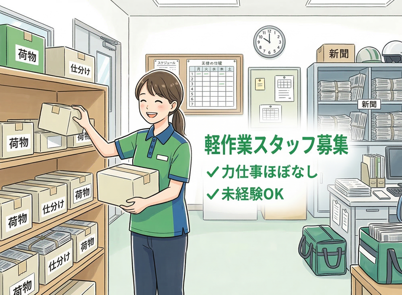 仕事内容: 新聞の配達漏れ対応(電話当番) 朝刊の配達後、お客様からの「新聞が届いていない」 「間違って入っていた」などの連絡を受ける係です。 電話を受けて、新聞をお届けするだけの簡単な対応です。 専用マニュアル・対応シートあり。 経験がなくても丁寧に教えます。 クレームではなく、確認や連絡が中心の 穏やかな内容です。 ■ 軽貨物の荷物仕分け作業 小型荷物(4.5kg以内)を町名ごとに仕分ける作業です。 棚ごとに振り分けていきます。 荷物が軽く力仕事は少なめです。 配達者が出勤する前に、スムーズに出発 できるように準備します。 ✅この仕事のポイント 室内作業中心で天候に左右されません 電話対応も社内のみ/マニュアル完備で安心 朝だけ短時間で副業やWワークに最適! 地域貢献につながる安定業務!