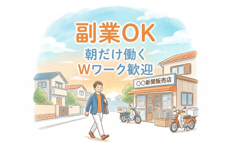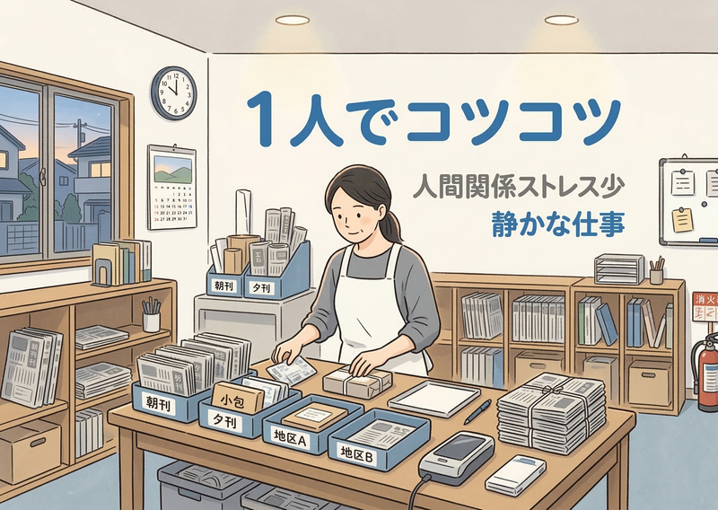 アピールポイント: ■ 朝3時間だけの短時間勤務 早朝の時間を有効活用。副業やWワーク、家事との両立にもピッタリです。 ■ 力仕事ほぼなしの軽作業 荷物は小型(4.5kg以内)。体への負担が少ない仕事です。 ■ 未経験歓迎・マニュアル完備 電話対応や作業はマニュアルがあります。初めての方でも安心して始められます。 ■ 室内作業中心で天候の影響なし 雨の日でも安心して働けます。 ■ 1人でコツコツ働ける環境 自分のペースで集中して仕事ができます。 ■ 地域に役立つ仕事 「新聞が届いた、ありがとう」と感謝されることもある、地域を支える仕事です。 ■ 幅広い年代が活躍 主婦(夫)、シニア、年齢問わず働きやすい環境です。