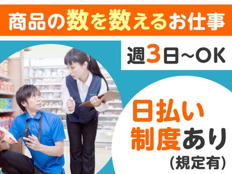 仕事内容 <初バイト・未経験OK>シンプル作業/コツコツ作業が好きな方歓迎 コンビニや100円shopを巡回し、 店内の商品を数え、スマホサイズの 専用端末に数を入力するお仕事。 接客なし! 【具体的には…】 (1)スマホサイズの端末で商品のバーコードを読取 (2)商品数をカウント (3)端末に数を入力 勤務先の店舗は… コンビニや100円ショップなど ※近隣の市区町村や隣県のお仕事もご案内可能。 ※勤務先は毎日異なります。 ※出張あり(他県の場合もあり) 1日の流れをご紹介 <作業先へ直行> ↓ <到着・作業> 複数人で1日1~2件回ります♪ 頼りになるリーダーがいるので安心! ↓ <直帰> ※駅チカ案件も多数有り。 ※営業所からの無料の送迎もあります。 バイト・パートデビューの方も安心して働ける◎ ★シンプル作業&サポート体制ばっちり◎ 頼りになるリーダーもいるので 棚卸未経験&ブランクがある方も安心 ★基本重い物を運ぶ作業はありません こんな方が活躍中! ◆バイトが初めての方 ◆”遊び”や”趣味”に使うお金を稼ぎたい方 ◆夢や目標に向かって頑張っている方 ◆バイト仲間を作りたい方 ◆学校が休みの日だけ働く方 ◆子育てが一段落した方 ◆久しぶりの仕事復帰の方 ◆コツコツ作業が好きな方