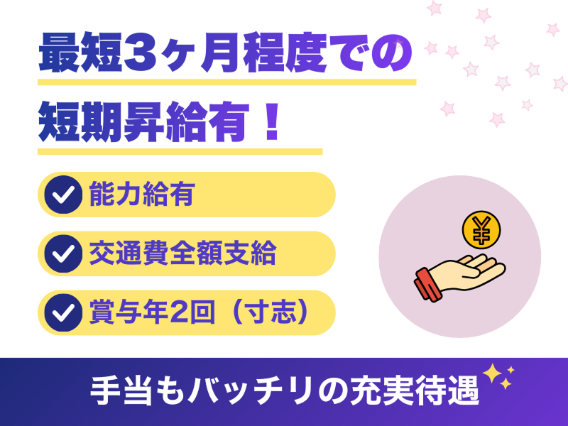 時給1,160円~1,200円 給与: 時給1,160円〜1,200円 +能力給 +交通費全額支給 +賞与(寸志)年2回 ◆短期昇給有 手当支給例 入社3ヶ月:評価手当+3000円/月 入社5年:技術手当+13000円/月