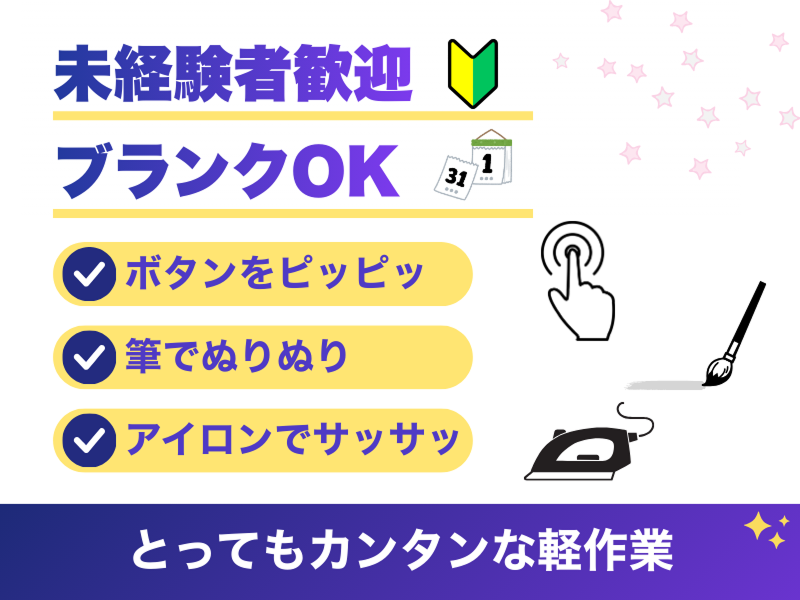 仕事内容: 冷暖房完備の室内で行う、 未経験から始められるシンプルな軽作業です♪ 【具体的な作業】 ・機械のボタン操作 ・ボンドを筆でサッと塗る作業 ・カンタンなPC入力(文字入力ができればOK) ・その他、軽い部材のチェック など どれもスグに覚えられる作業ばかり。 「集中してコツコツ作業するのが得意な方」にぴったりです◎ ▼こんな方が活躍中 ・セルフネイルが好き ・DIYや工作が好き ・手先を使う細かい作業が好き ・もくもく作業が落ち着く 成果が目に見えてわかるから、やりがいも感じられます♪
