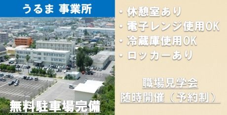 職場環境 【従業員構成】 ■車通勤OK!高速出口からスグで通いやすい! 石川ICを降りてスグ! もちろん無料駐車場完備なので通勤も楽ラク! うるま市からはもちろん、 沖縄市、宜野湾市、北谷町、金武町 名護市、浦添市から通勤している方もたくさん在籍しています! 【職場の雰囲気】 落ち着いた職場 協調性がある 業務外交流多い デスクワーク 長く働ける 力仕事が少ない