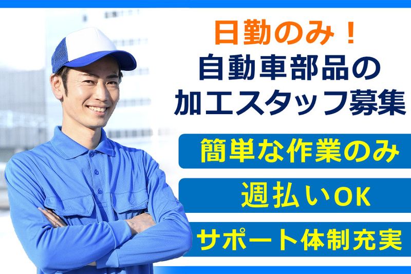 【仕事内容】 【トヨタ系】 キレイな工場で、自動車部品の加工のおシゴト! \おすすめポイント/ ✅扱うのは軽いプラスチック部品 ✅ライン作業なし ✅体への負担少ない ✅難しい仕事内容なし 【主な作業はこれだけ】 ・成形機に部品をセットして加工 作業はカンタン、 集中すると時間はあっという間に過ぎます。 私にもできるかな...と心配な方も、 丁寧な説明と入社前工場見学で不安解消! 未経験の方も安心して皆さんスタートされます○ ============= このお仕事の評価 ============= 仕事の難しさ 【 ■・・・・ 】 体への負担度 【 ■■・・・ 】 給与など条件面 【 ■■■■・ 】 職場環境 【 ■■■■■ 】 ============== 職場環境が自慢です ============== (自慢その1) 周辺エリアの工場と比較しても 圧倒的にキレイなのも魅力のひとつ。 働きやすい環境も整っており 女性も多く活躍していますっ○ (自慢その2) 「職場でのドリンク無料」 休憩中など、あったら結構うれしいっ○ (自慢その3) 在籍スタッフさんも温厚な方が多く いざ困ったときには頼りになります○ 基本人間関係を気にせず、もくもく作業OK 条件よく、お仕事内容も負担が少なく 未経験でも働けます。 キツイお仕事内容や変わった条件はございません。 少しでも気になったらお気軽にご応募ください! まずは話だけ聞きたい、 とりあえず登録したい、 そんな方にもオススメです○ 【同時募集】 別部署で女性スタッフ活躍中のお仕事もあります。 まずはご相談ください。 【求人ID-ART】