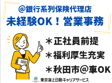 仕事の内容 \土日休みの事務職×正社員へ!/ ◆未経験OK!お仕事しながら覚えていけばOK ◆福利厚生充実◎ ◆車通勤可@秋田駅から徒歩圏内! 【基本情報】 雇用形態:紹介予定派遣(正社員) 雇用期間:長期(3カ月以上) └2月~開始日相談可能*即日勤務OK 就業時間:8:45~17:00(休憩60分) 【必須条件】 ◆パソコン:基本操作(パワーポイント資料作成、エクセル・ワード新規作成) 【お仕事内容】 ・保険申込時の事務処理 ・お客様からの問合せ対応 ・保険更新のご案内 など 【未経験からの保険デビュー応援♪】 ・保険の商品知識やシステム操作はお仕事しながら覚えていけばOK ・対人対応もスキルいかせます! 【ご勤務決定後に損保資格を取得して頂きます】 難しい試験ではないのでご安心ください ・合格率90%以上! ・試験は選択式&一部テキスト参照OK 【定年まで安定勤務叶います☆彡】 ・年収240万~ ・昇給・賞与あり!退職金あり ・財形あり ・社宅制度あり ・転勤なし!U・Iターン歓迎 【環境面等】 ・30代・40代・50代の多い職場 └幅広い年代活躍中/子育てに理解ある主婦(夫)が活躍中 ・オフィスカジュアル内で服装自由 └更衣室あり 【福利厚生等】 ・ランチタイムは休憩スペース利用OK └お弁当持参OKです ・社会保険完備 ・車通勤OK ・禁煙オフィス!煙苦手な方も安心 ・平日のみOK!土日祝休み ・年間休日120日以上&お休み相談可 └有給休暇、罹災休暇、隔離休暇、結婚休暇、出産休暇、生理休暇、忌引休暇、公務休暇、裁判員休暇 ○●ご応募検討中の方へ●○ ・@秋田市内で腰を据えて長くお仕事したい方にぴったりの職場です!ご応募お待ちしています! ○●嬉しいPOINTたくさん!●○ 正社員前提/紹介予定派遣/開始日相談/主婦・主夫活躍中/子育てに理解のある職場/保険未経験OK/社保完備/残業月5時間以内/17時退社/7.5時間以内勤務/交通費全額支給/残業代全額支給