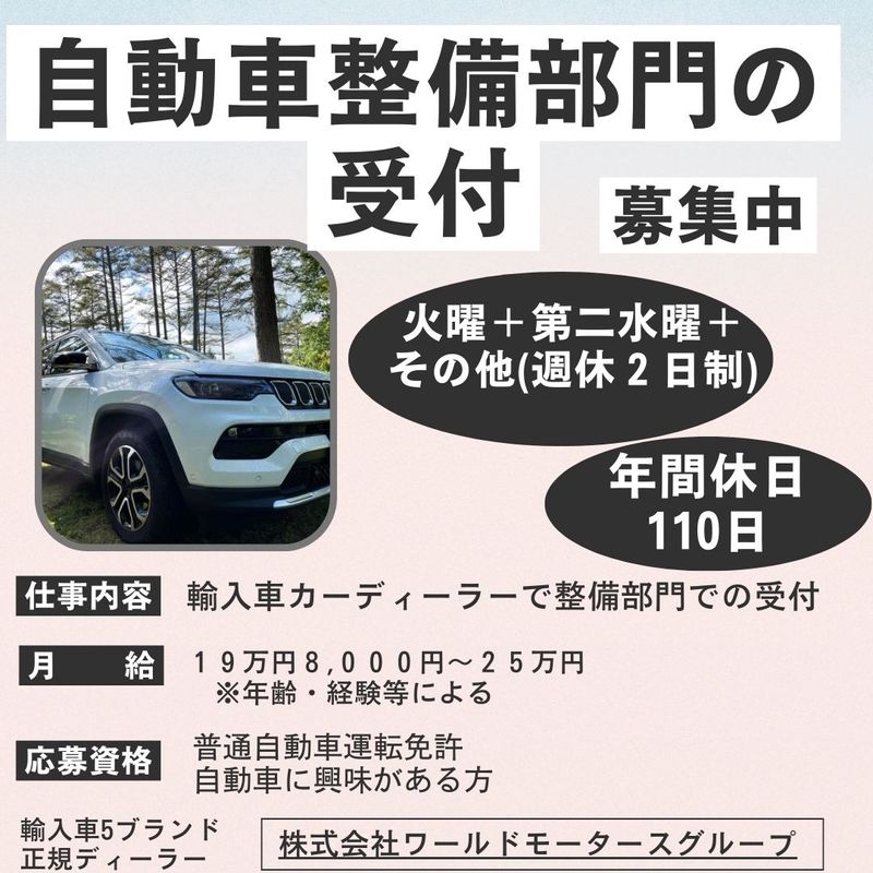 仕事内容 輸入車カーディーラーで 整備部門での受付担当として お仕事をお任せします! 【具体的には・・・】 ■自動車整備部門の受付 ・お問い合わせ、来店対応 ・お客様からの整備などの要望を受け、 整備士に内容を伝達 ・整備士からの内容をデータ化 (見積書等の作成) ・整備内容の説明、提案 お客様と整備士の間に入り、 お車の状態をお伝えする仕事です ■その他業務 ・お客様にメンテナンスの提案 ・電話対応・顧客管理などのフロント業務 【入社後の流れ】 OJT中心に、まずは1ヶ月・12か月点検から 対応し、慣れてきたら車検など複雑なものを 担当していただきます 慣れるまで先輩がしっかりサポート! 【やりがい】 例えばどのようなタイミングでランプが点灯するか どこが一番困っているかなどを聞き出し、 どこに不具合があるかを整備士に伝えます どこまで具体的に聞き出せるかがポイントとなり 的確に整備士に伝え、 解決したときは達成感があります ※お仕事番号/Chr1813-009
