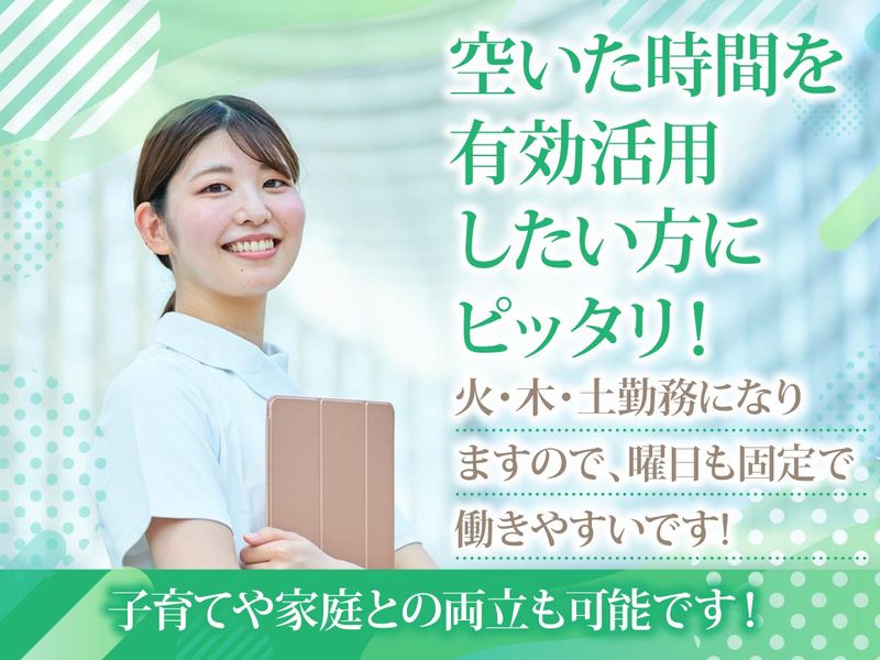 勤務時間詳細 <火曜日・木曜日・土曜日に勤務できる方のみの募集です!> ◆外来/月・火・木・金(午前診と午後診の間は、休憩となります) 午前診/8:30〜12:30 午後診/14:30〜18:30 ◆外来/水・土(水曜・土曜は午前のみ) 午前診/8:30〜12:30 ======================= ◎週2、3日~で相談OK! ◎勤務時間の相談もお気軽に! ◎午前のみ・午後のみなども相談OK! ◎子育てや介護など少ししか働けない方でも柔軟なシフト対応で両立も可能です!
