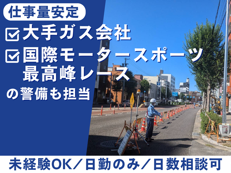 仕事内容 \ 楽・安心・未経験OK! / キツくない。焦らない。未経験でも安心。 生活インフラを守る警備だから、 落ち着いた現場で、体の負担も少なめ。 「警備の仕事は初めて…」も 気軽に始められるアルバイトです。 ■ この仕事が「楽・安心」な理由  ̄ ̄/ ̄ ̄ ̄ ̄ ̄ ̄ ̄ ̄ ̄ ̄ ̄ ̄ ̄ ̄ ̄ 担当するのは、 東邦ガス関連工事の交通誘導が中心。 ✅ 工事は計画的・突発対応なし ✅ 深夜・長時間作業ほぼなし ✅ 交通量が落ち着いた現場が多め ✅ 2~4名のチーム制で、必ず先輩と一緒 「走り回る」「怒鳴られる」「一人ぼっち」 そんな現場はありません。 _/_/_/_/_/_/_/_/_/_/_/_/_/_/_/_/_/_/ ■ 仕事内容  ̄ ̄ ̄ ̄ ̄ ̄ ̄ ̄ ̄ ̄ ̄ ̄ ̄ ̄ ̄ 名古屋市中川区の現場で ・ガス工事に伴う交通誘導・安全確保 ・通行人・車両のご案内 慣れてきたら、 ・商業施設の警備 ・イベント警備 などもお願いします。 ※一定期間同じ現場の場合、直行直帰OK ■ 入社後の流れ  ̄ ̄ ̄ ̄ ̄ ̄ ̄ ̄ ̄ ̄ ̄ ̄ ̄ ̄ ̄ ① 法定研修(3日間) 警備の基礎・安全知識をしっかり習得 ↓ ② 現場デビュー 必ず先輩と一緒なので安心! 1人で現場に立つことはありません。 _/_/_/_/_/_/_/_/_/_/_/_/_/_/_/_/_/_/ ■ 働きやすさ  ̄ ̄ ̄ ̄ ̄ ̄ ̄ ̄ ̄ ̄ ̄ ̄ ̄ ̄ ̄ ✅ 日数相談OK ✅ 曜日固定/平日のみ/土日のみもOK 「今月は少なめに」 「来月はしっかり入りたい」 など、自分の予定に合わせて調整可能! _/_/_/_/_/_/_/_/_/_/_/_/_/_/_/_/_/_/ ■ 当社について  ̄ ̄ ̄ ̄ ̄ ̄ ̄ ̄ ̄ ̄ ̄ ̄ ̄ ̄ ̄ 生活インフラ警備だけでなく、 ・名古屋城 ・鈴鹿サーキット(F1開催地) など、大手・有名施設の警備実績も多数。 創業36年、 安定した受注がある警備会社です。
