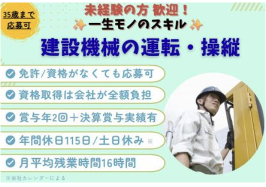 求めている人材 ⋆˖✧⋆˖✧⋆˖✧⋆˖✧⋆˖✧⋆˖✧⋆˖✧⋆˖✧⋆˖✨ 【歓迎条件】 ✦35歳以下の方(※未経験の場合) ✦建設機械オペレーター経験がある方 ✦車両系建設機械資格をお持ちの方 ✨✧⋆˖✧⋆˖✧⋆˖✧⋆˖✧⋆˖✧⋆˖✧⋆˖✧⋆˖✧⋆ \\こんな方におすすめ// v('▽')v  ̄V ̄ ̄ ̄ ̄ ̄ ̄ ̄ ̄ ̄ ̄ ̄ ̄ ̄ ̄ ̄ ̄ ✅建設機械の操作に興味がある方 ✅チームで協力して仕事を進めたい方 ✅スキルを身につけながら長く働きたい方 ✅福利厚生がしっかりした環境で働きたい方 ✅稼ぎたい!という方 未経験からでも挑戦できる環境があります。 入社後は先輩社員がしっかりと サポートするので安心してください。 資格取得も会社負担でサポート。 意欲的に学びたい方を歓迎します。 当社は中途入社の方が9割以上。 異業種からの転職者も活躍しています。 ⋆˖✧⋆˖✧⋆˖✧⋆˖✧⋆˖✧⋆˖✧⋆˖✧⋆˖✧⋆˖✨ 年齢の条件と理由:あり(例外事由3号のイ・35歳未満(長期勤続によるキャリア形成のため))