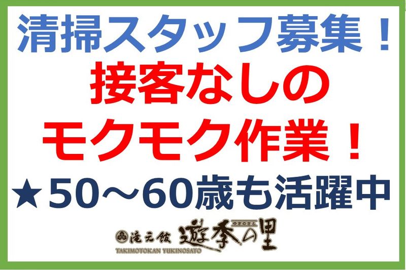 【仕事内容】 朝もやに霞むのどかな田園風景や宝石のように輝く夜景が見える当館にて、屋内の清掃スタッフを募集致します ▶日本の方が約7割ほど。年齢層は比較的高め、落ち着いたお客様が多いお宿になります。 【PRポイント】 ■休日の相談もOK ■接客なしの軽作業 ■短時間の業務です <具体的な仕事内容> ■館内の清掃、準備 ■室内浴場の清掃 ============== 安心のサポートで、 未経験でもすぐに活躍! ============== 入社した後は、先輩スタッフと一緒に仕事の流れを覚えていきます。 旅館のことでも、仕事のことでもスタッフ全員でサポートしていきますので、困ったことがあればお気兼ねなくご相談下さい。 ============ 滝元館のおもてなし ============ 滝元館 遊季の里は、全11室という小さなお宿。 そんな旅館だからこそ出来る「つかず、はなれず、さりげなく」の心配りで、お客様をおもてなしをいたします。